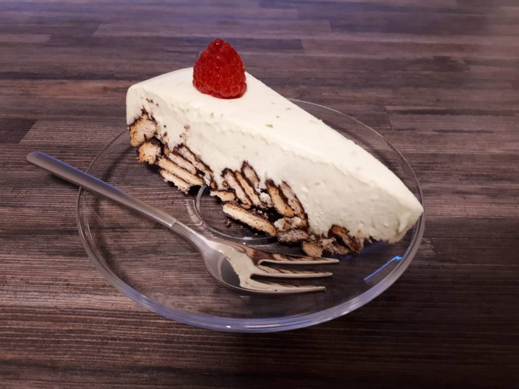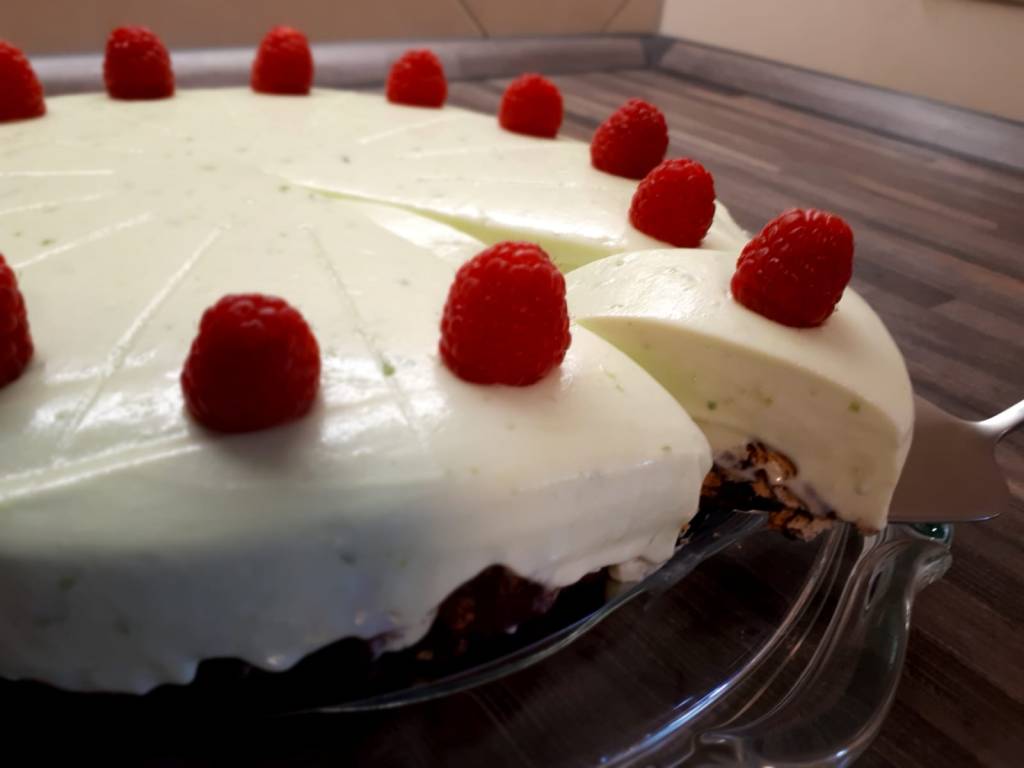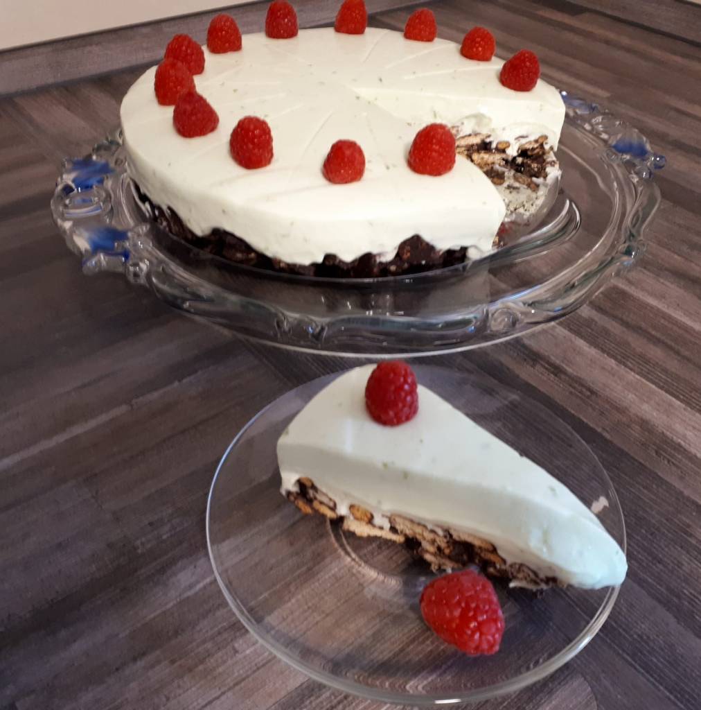 Zutaten: Boden: 200 g Butterkekse, 200 g Kuvertüre (Vollmilch oder Zartbitter); Belag: 400 g Frischkäse, 400 g gesüßte Kondenzmilch, 4 Limetten, 1 Zitrone ,¼ TL grüne Lebensmittelfarbe, 200 ml Schlagsahne, 2 Blatt Gelatine; Deko: einige Himbeeren
