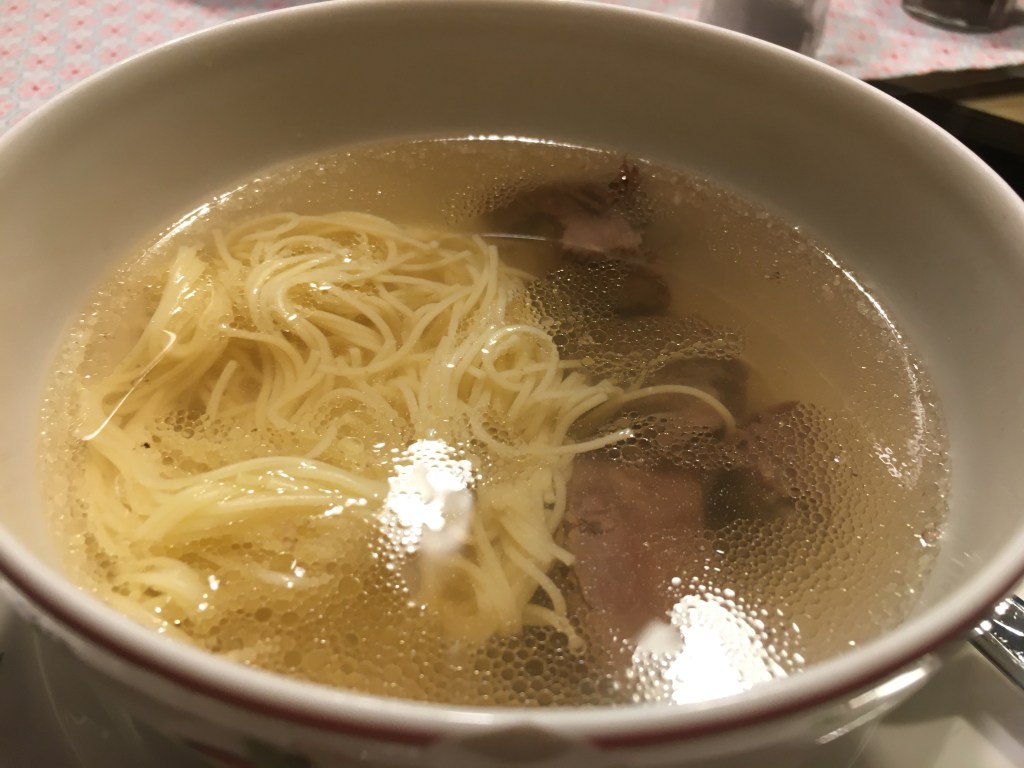 Zutaten: 500-600 g Bein-Scheibe mit Knochen, 1-2 Zwiebeln, 2 Lorbeer-Blätter, 2 Nelken, Salz, Pfeffer; In einem großen Topf 1,5 Liter Wasser aufkochen, das Fleisch hineingeben und etwa 5 Minuten kochen lassen, Schaum immer wieder weg nehmen; Zwiebeln und Gewürze zum Fleisch geben, jetzt die Hitze reduzieren und alles etwa 120 Minuten nur „simmern“ lassen (also nicht mehr kochen). So bleibt die Rinderbrühe schön klar und wird nicht trüb. Nach der Garzeit wird die Brühe durch ein Sieb gegossen – das Fleisch kann beliebig weiter verarbeitet werden (in Scheiben oder in Würfel geschnitten)