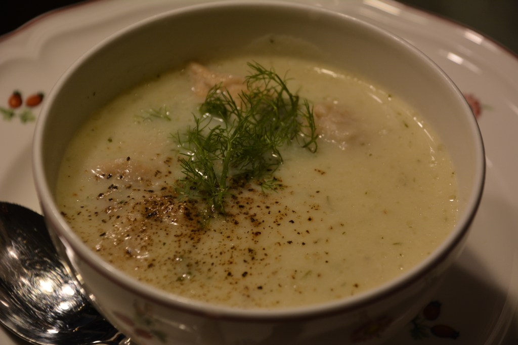 Zutaten: 1 mittelgroße Knolle Fenchel, 300 g Kartoffeln, 1/2 mittelgroße Knolle Sellerie, 2 Zwiebeln, 300 ml Gemüsebrühe, 2 EL weiße Essig, Salz, Pfeffer, Öl, 100 ml Sahne
