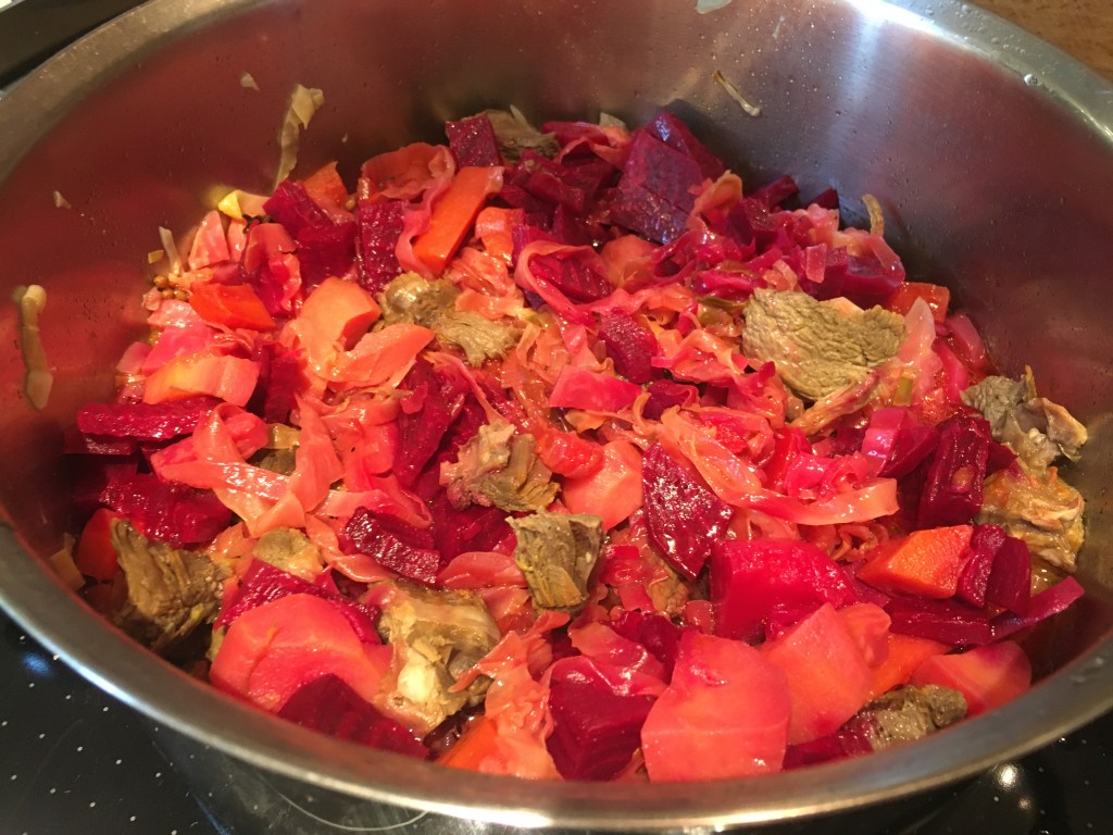Zutaten: 500 g Rote Bete, 200 g Zwiebeln, 200 g Möhren, 200 g Knollensellerie, 200 g Kartoffeln, 200 g Weißkohl, 200 g Lauch (Porree), 300 ml Pils, Salz, Öi (ich hatte Rapsöl), Pfeffer, Koriander- Körner, Fleisch (Rind vorgekocht, beliebig)