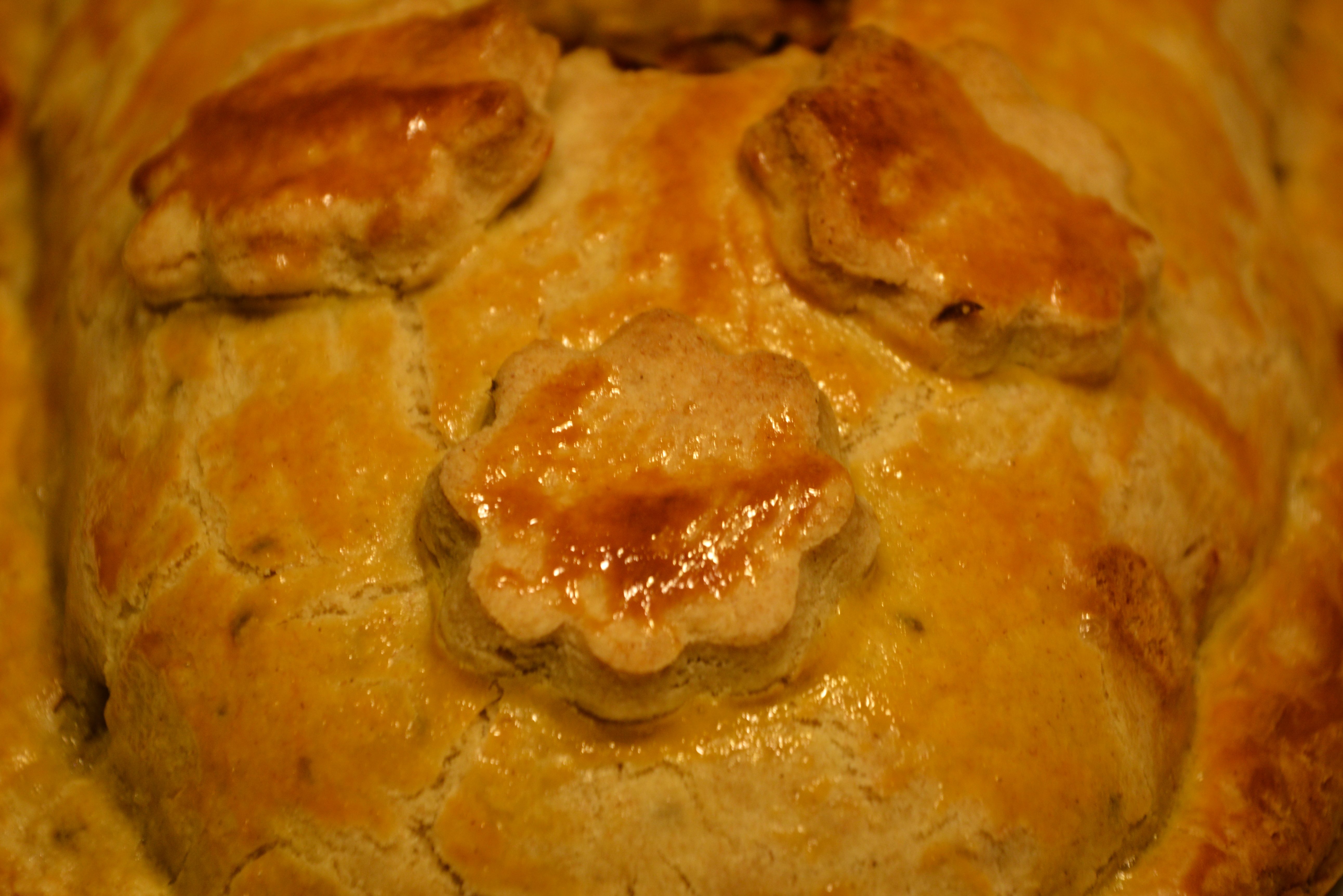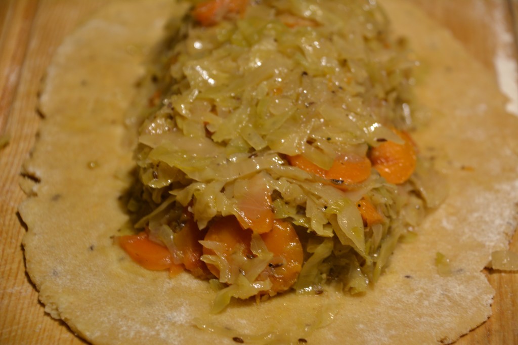 Zutaten: Teig: 600 g Weizenmehl, 300 g Butter, Salz, 1 Ei; Füllung: 900 g Weißkohl, 200 g Zwiebeln, 3 Möhren, Salz, Pfeffer, Petersilie (frisch), Öl; 1 Eigelb zum Bestreichen