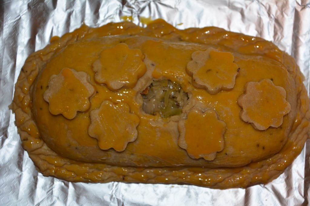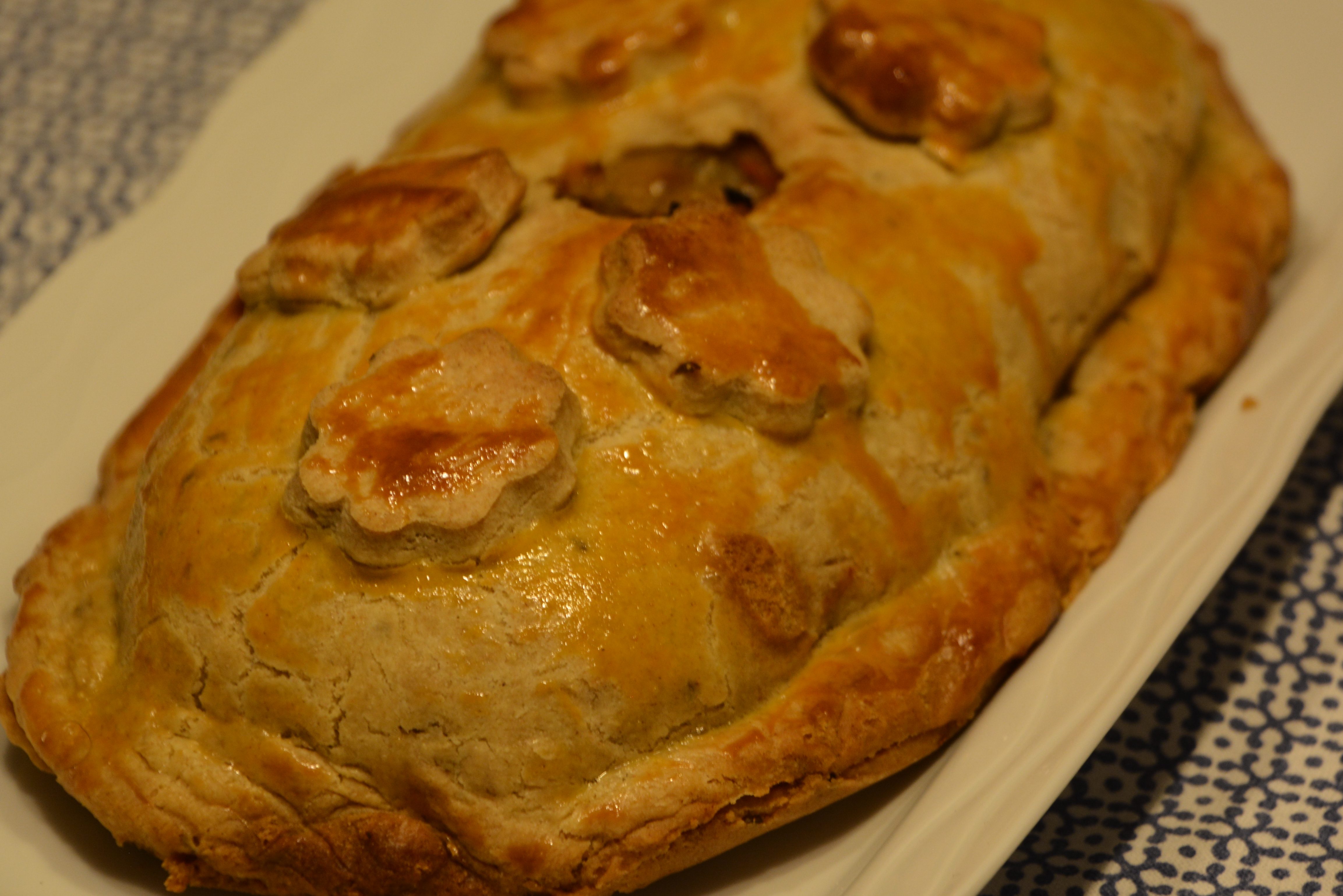 Die Zutaten für den Teig zu einem geschmeidigen Teig kneten, 1 Stunde kühl stellen; Kohl schneiden, in Salzwasser 5 Minuten blanchieren; Zwiebeln, Möhren, Kohl in Öl andünsten, würzen; den Teig in 2 Stücke teilen, zu 2 Teigplatten von 3-4 mm Dicke ausrollen; die Füllung in Form eines länglichen Blocks auf eine Platte geben, mit der anderen bedecken; die verzierte Pastete in Alufolie bei 200 Grad Umluft in einem vorgeheizten Backofen 45 Minuten backen