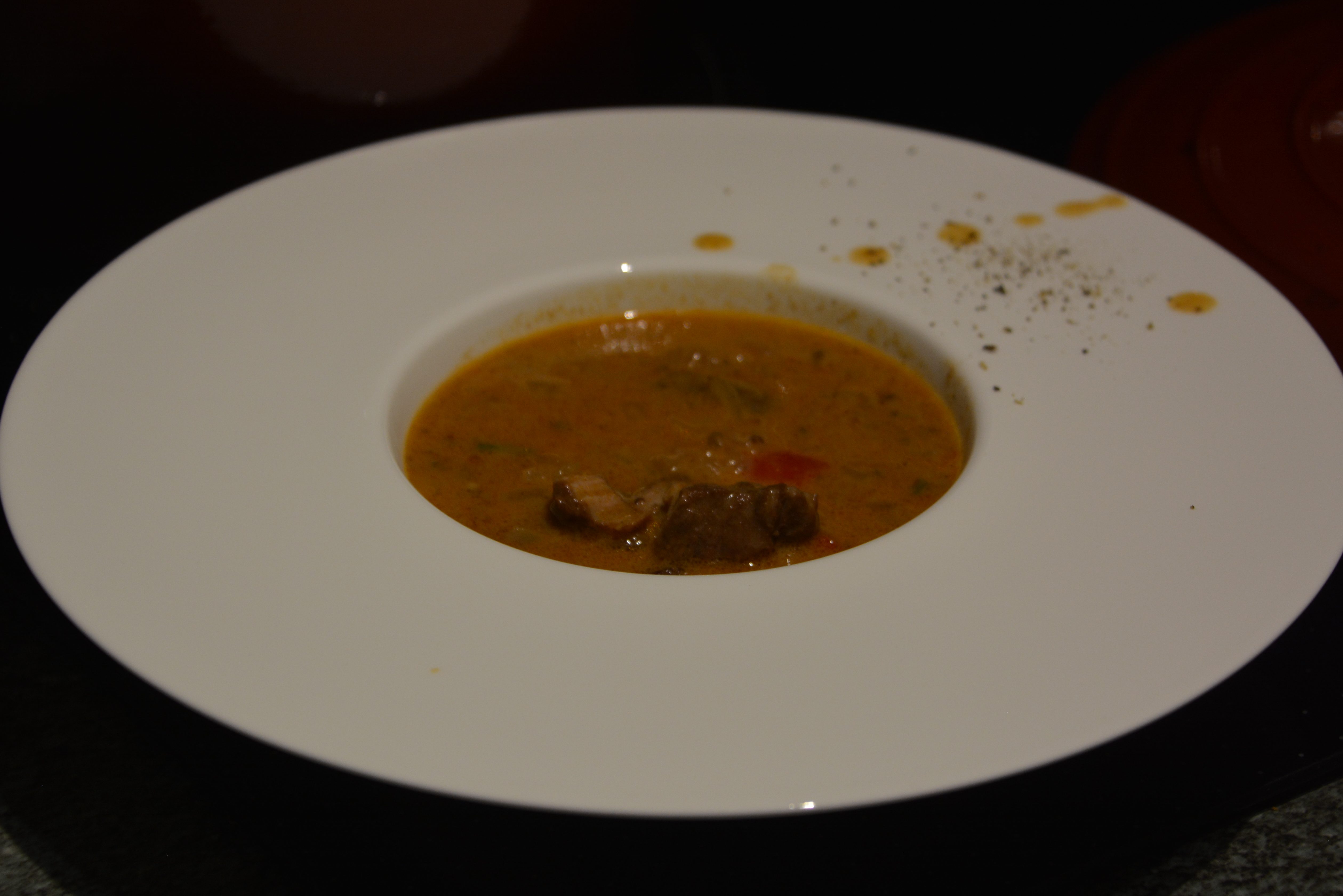 Zutaten: 1 kg Kalbsschulter, 40 g edelstes Paprikapulver, 1 EL Kümmel, 1 kg Zwiebeln, 100 g Schmalz, Olivenöl (ca. 50 ml), Salz, Pfeffer, Wacholderbeeren 5-6 St, Koriander-Samen, 2 EL Mehl, 2 EL Tomatenmarkt, 100 ml Weißweinessig, 500 ml Kalbsfond, 2 rote Paprikaschote, 1 Knoblauchzehe, abgeriebene Schale von 1/2 unbehandelten Zitrone, 200 ml Sahne