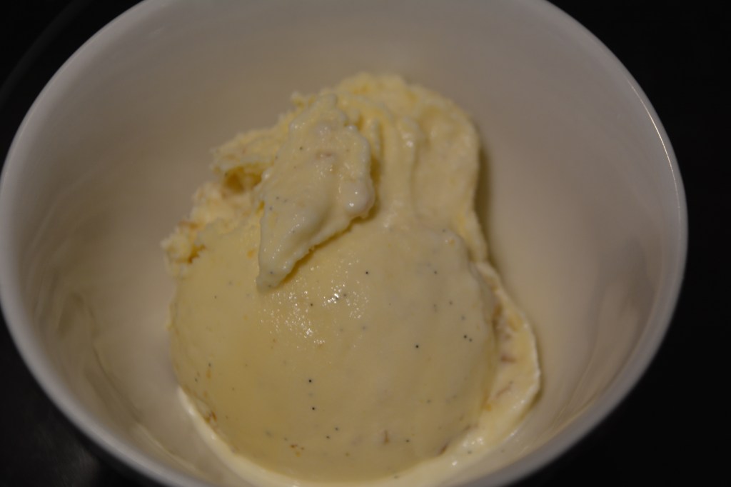 Zutaten: Eis: 1 Vanilleschote, 3 Eigelb, 90 g Zucker (ich nehme 50 g), etwas Salz, 300 ml (Milch und Sahne); 100 g geröstete Erdnüsse, zerkleinern