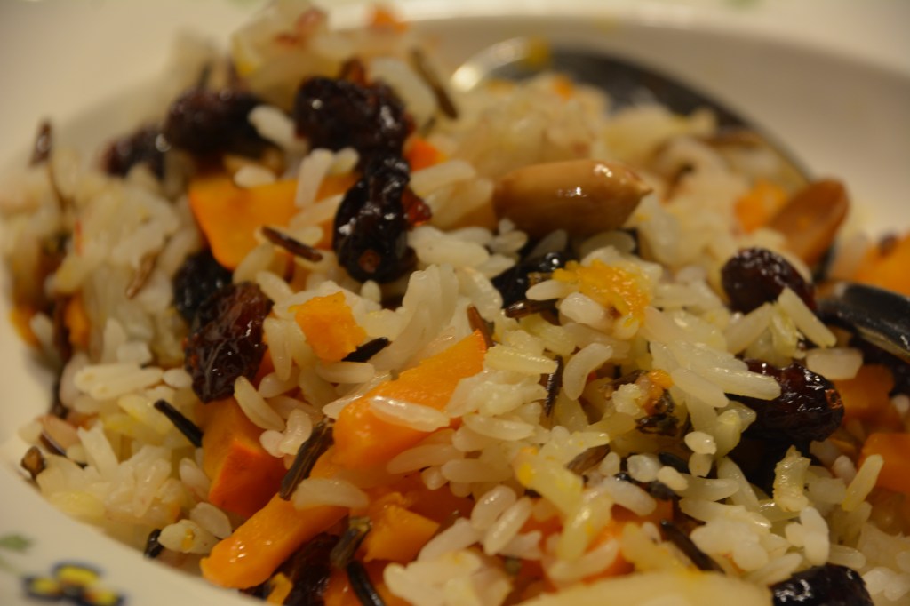 Zutaten: 350 g Basmatireis (vorher 2 Stunden in stark gesalzenem kaltem Wasser einweichen), 200 g Butter (flüssig), 1/2 Kürbis, 100 g Berberitzen, 2 Boskop-Äpfel, 100 g Erdnüsse, für den Boden: 3 Kartoffeln, 1 Zwiebel; Salz, Pfeffer; Den Reis ins sprudelnd kochende Wasser geben und erst umrühren (nur ein Mal!) wenn das Wasser wieder blubbernd kocht, 7 min weiterkochen, dann abgießen und abtropfen. Die Butter zerlassen. Einen Topf (gusseisernen!) auf dem Herd auf höchster Stufe erhitzen. Kartoffeln, Zwiebel (alles halbieren) auf dem Topfboden verteilen; Früchte, Nüsse und Reis schichten, den Reis nicht festdrücken. Die Butter über dem Gericht verteilen. Den Topfdeckel mit einem feuchten Tuch umwickeln und auf den Topf setzen. Die Herdplatte auf die niedrigste Stufe stellen, 40 min weitergaren