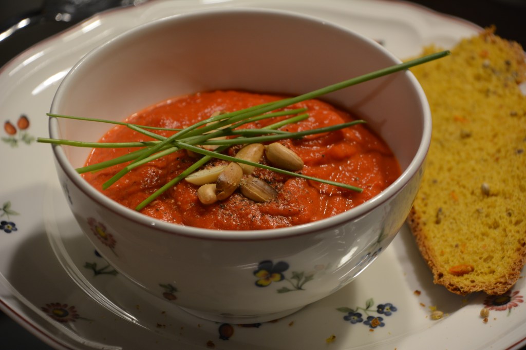 Zutaten: 1 Kürbis (600 g), 1 Möhre, 1 Zwiebel, 1 Rote Bete, 1 Tomate, Ingwer frisch (beliebig viel) in 500 ml Wasser langsam köcheln, pürieren, mit Weißwein (100 ml), weißem Essig (30 ml), 3 EL Curry, Salz, Pfeffer abschmecken, 100 ml Sahne unterrühren