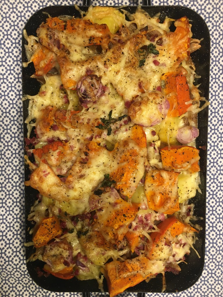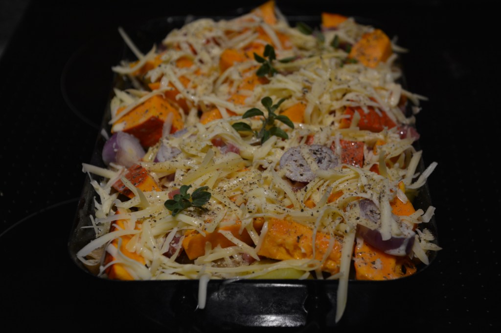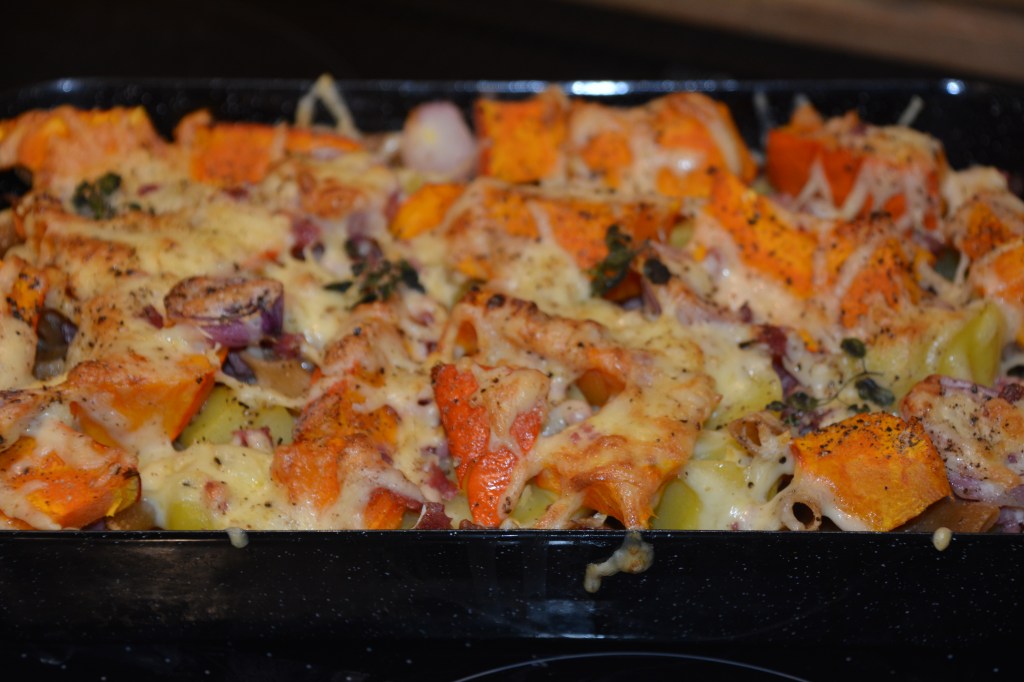 Zutaten: 1 kg Kürbis, 400 g Kartoffeln, 150 g klein gewürfelter Schinken, 100 g geriebener Gruyere, 1 Zwiebel, 1 Zucchini, Salz, Pfeffer, Majoran; Guss: 2 Eier, 100 ml Sahne, 100 g Mascarpone, Salz, Pfeffer; Gemüse in Würfelnden schneiden, Kartoffeln 10 Minuten köcheln, Backofen auf 200 Grad vorheizen, Guss vorbereiten, gut würzen, Käse reiben, Gratinform einfetten, Kürbis-Kartoffel-Zucchini-Zwiebel-Schinken-Mix und Käse in der Form verteilen, Guss darüber giessen; 30 Minuten backen