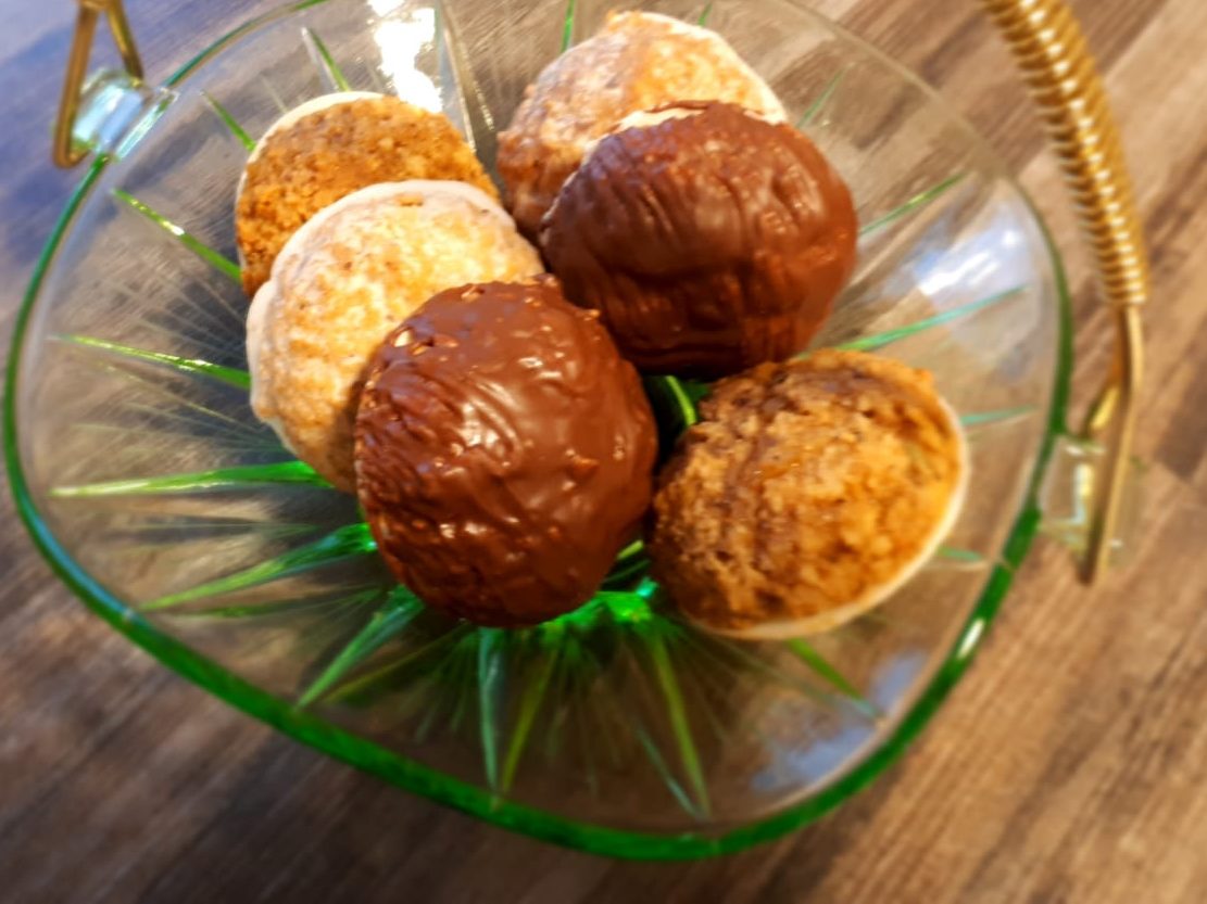 Zutaten: 1 TL Lebkuchengewürz,  ½ – 1 TL Zimt,  1 ½ EL Rum, 100 g Zitronat, 100 g Orangeat, 2 EL Zitronenabrieb, 2 EL Orangenabrieb, 1 Prise Salz, 2 Eier , 100 g Braunen Zucker, 100 g Marzipan, Rohmasse, 25 g Mehl, ½ TL Backulver, 100 g Mandeln, gehackt, 150 g Haselnüsse, gemahlen, ½ Pckg. Backoblaten, Durchmesser 5cm; Glasur: Vollmilchschokolade, Zartbitterschokolade oder Zuckerguss, gerne auch mit Zitronensaft, Rum, Grand Marnier, …