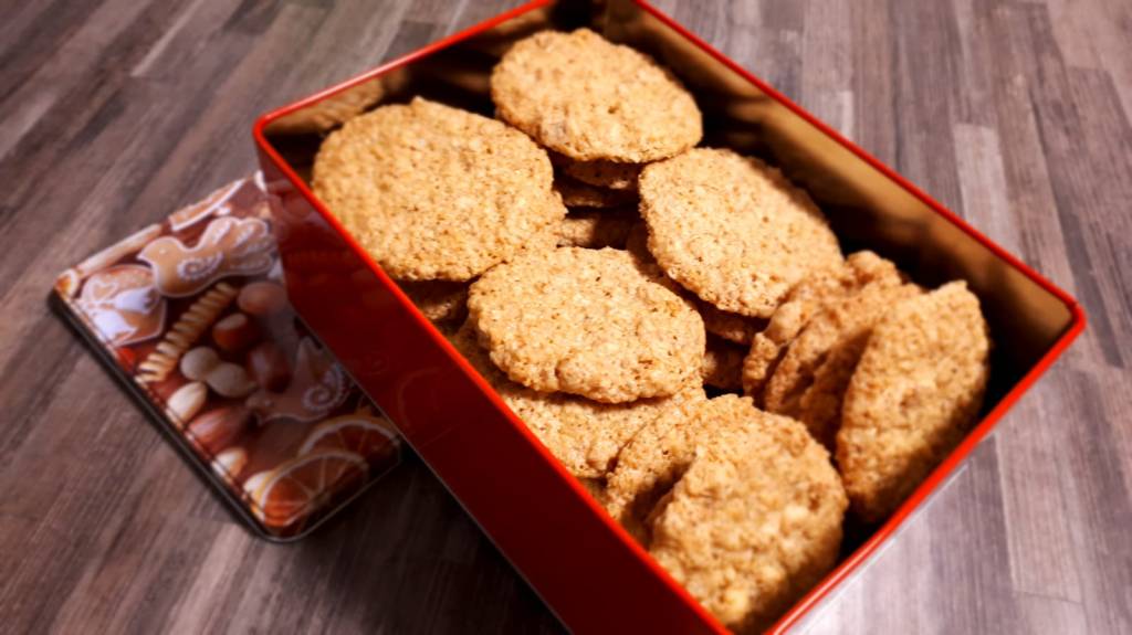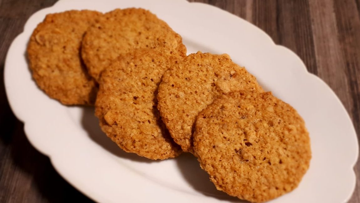 Zutaten: 175 g Margarine, 250 g Haferfloken, zart oder extra zart, 50 g Mehl, 1 ½ TL Backpulver, 2 Msp Zimt, 175 g Zucker, 80 g Nüsse (Haselnüsse oder Walnüsse), gehackt , 2 Eier