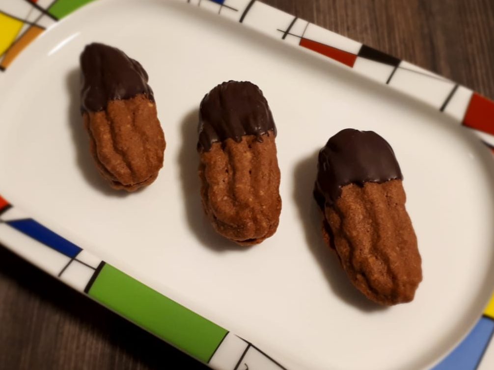 - 150g Küvertüre im Wasserbad schmelzen und ein Ende des Stangerl eintauchen oder mit Hilfe eines Backpinsel bestreichen, Unterseite abstreifen und zum Auskühlen auf Backpapier legen