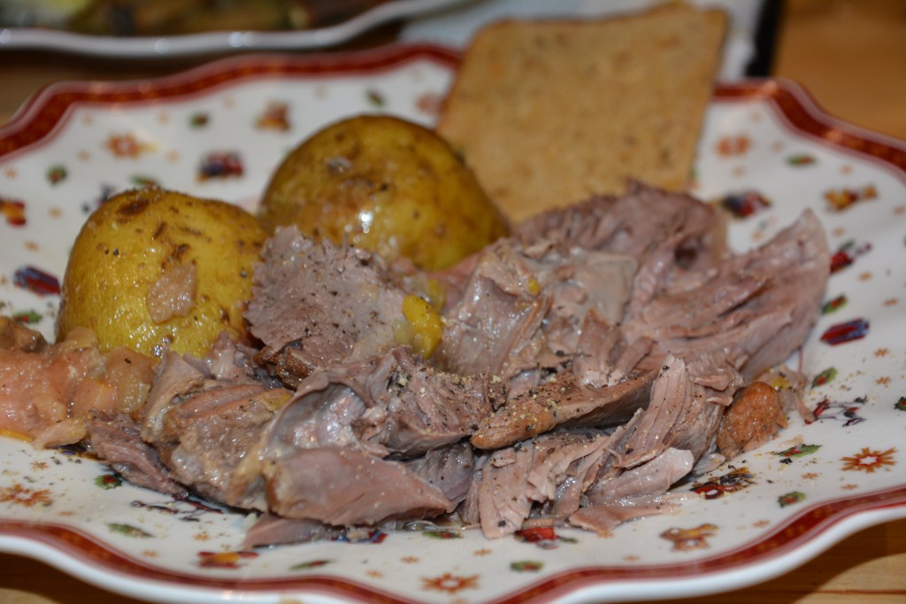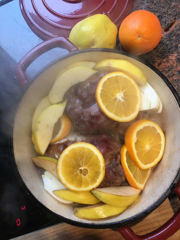 Zutaten: 2 große Putenkeulen über Nach marinieren; Marinade: Salz, Pfeffer, Rosmarin, 300 ml Weißwein, 3 EL Honig; das Fleisch kurz anbraten, in der Marinade in einem Topf (am besten in einem gusseisernen) mit 2 Quitten und 1 Bioorange 3 Stunden bei niedriger Temperatur köcheln