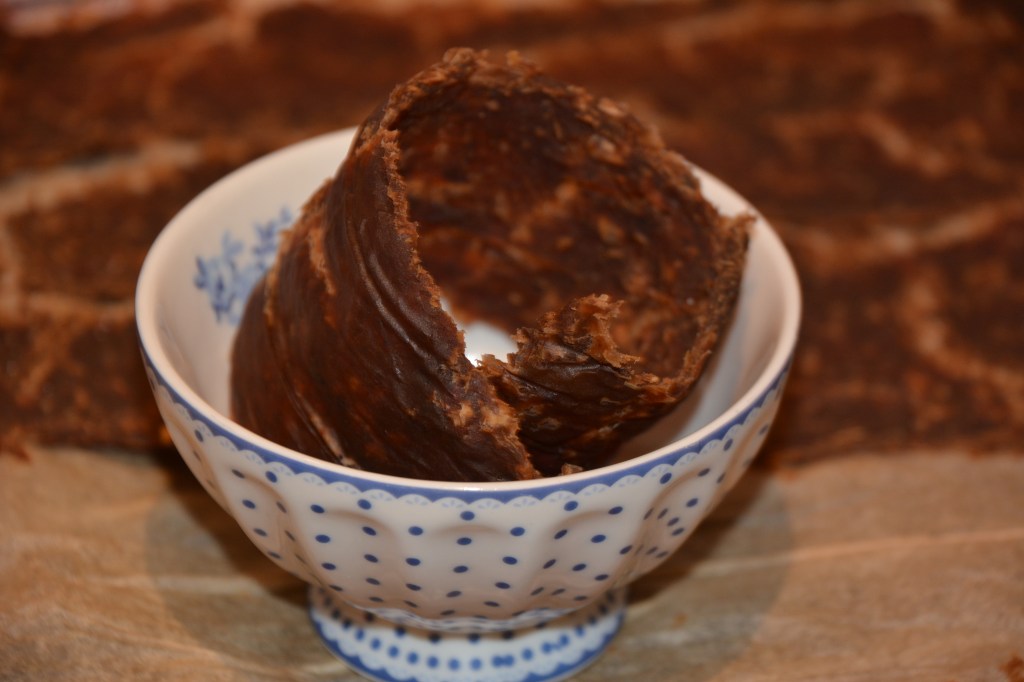 Zutaten: Äpfel klein schneiden, mit etwas Zucker (ich hatte 100 g Zucker für 2 kg Äpfel) kurz aufkochen, pürieren und auf einem Blech verteilen; zuerst bei 100 Grad (Umluft) 1 Stunde in einem vorgeheizten Backoffen, danach – 2 Tage bei Zimmertemperatur dörren lassen
