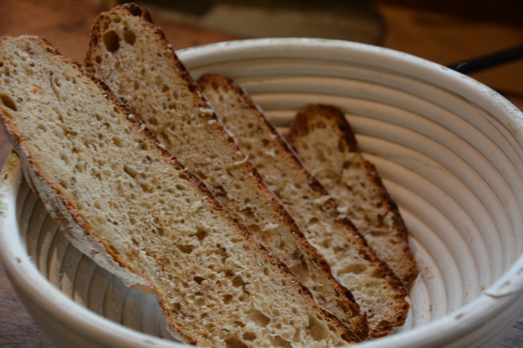 Zutaten: 350 g Dinkelmehl, 150 g Weizenmehl, 20 g Hefe, 300 ml Joghurt , 1 EL Zucker, 1 EL Salz, 300 g Wurzelpetersilie -Püree, Brotgewürz (Koriander, Anis); alle Zutaten zu einem glatten Teig 10 Minuten mit Hilfe einer Küchenmaschine kneten, 2 Stunden reifen lassen, in einem vorgeheizten Holzofen bei 180-200 Grad 1 Stunde backen