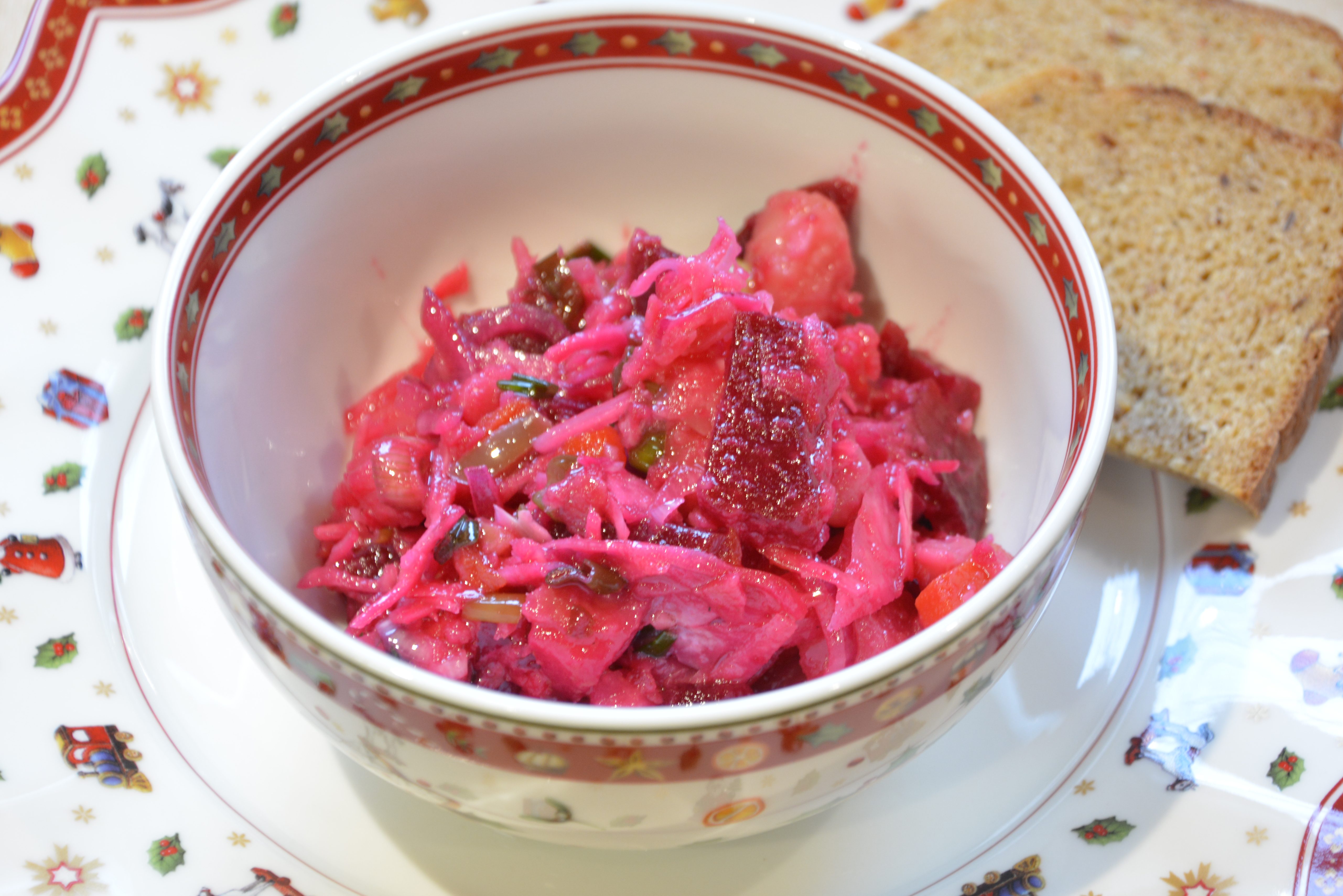 Zutaten: Gemüse (3 Kartoffeln, 2 Rote Bete, 2 Möhren) weich kochen, klein schneiden; 2 Zwiebeln und Schnittlauch schneiden und dazu geben, alles mit 300 mg Krautsalat vermischen, salzen, mit 100-150 ml Öl (schmeckt gut Rapsöl) übergießen; 2 Tage im Kühlschrank reifen lassen