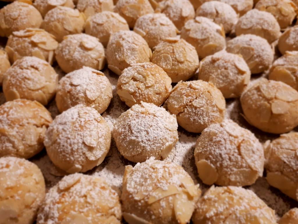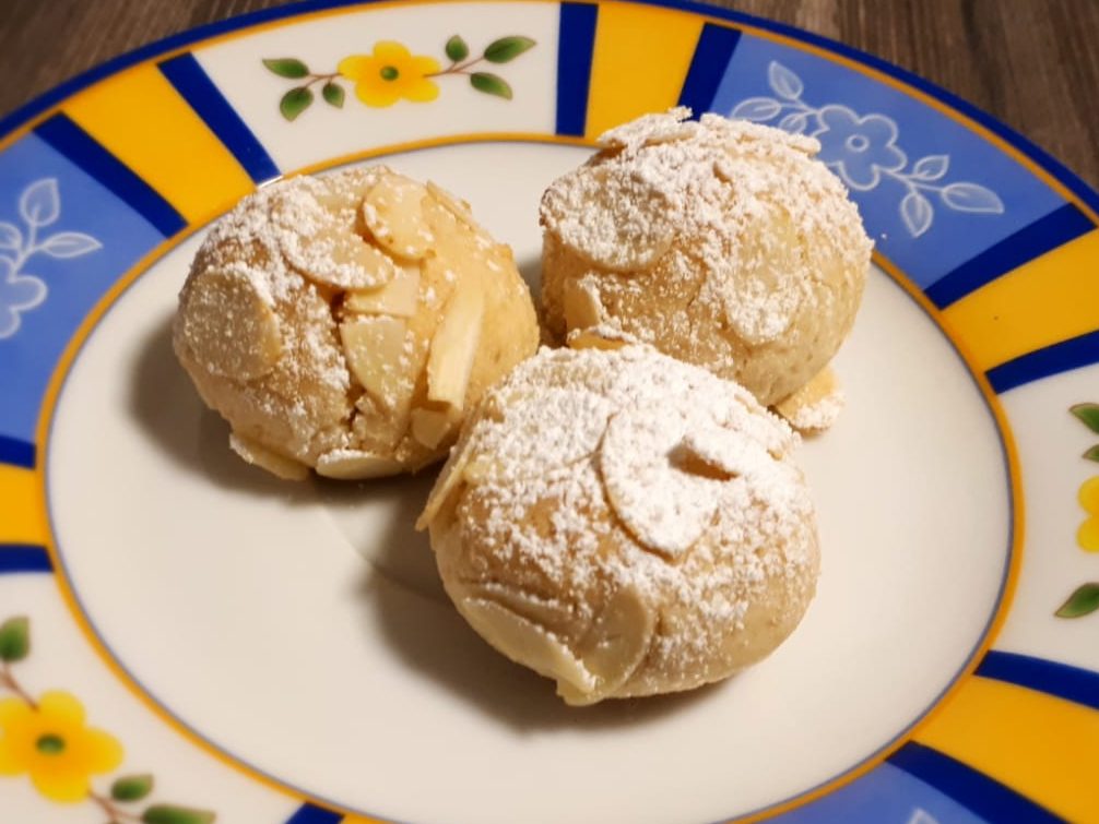 - aus ca. 15g Teig Kugeln rollen, dann in den Mandelblättchen wälzen und diese etwas andrücken