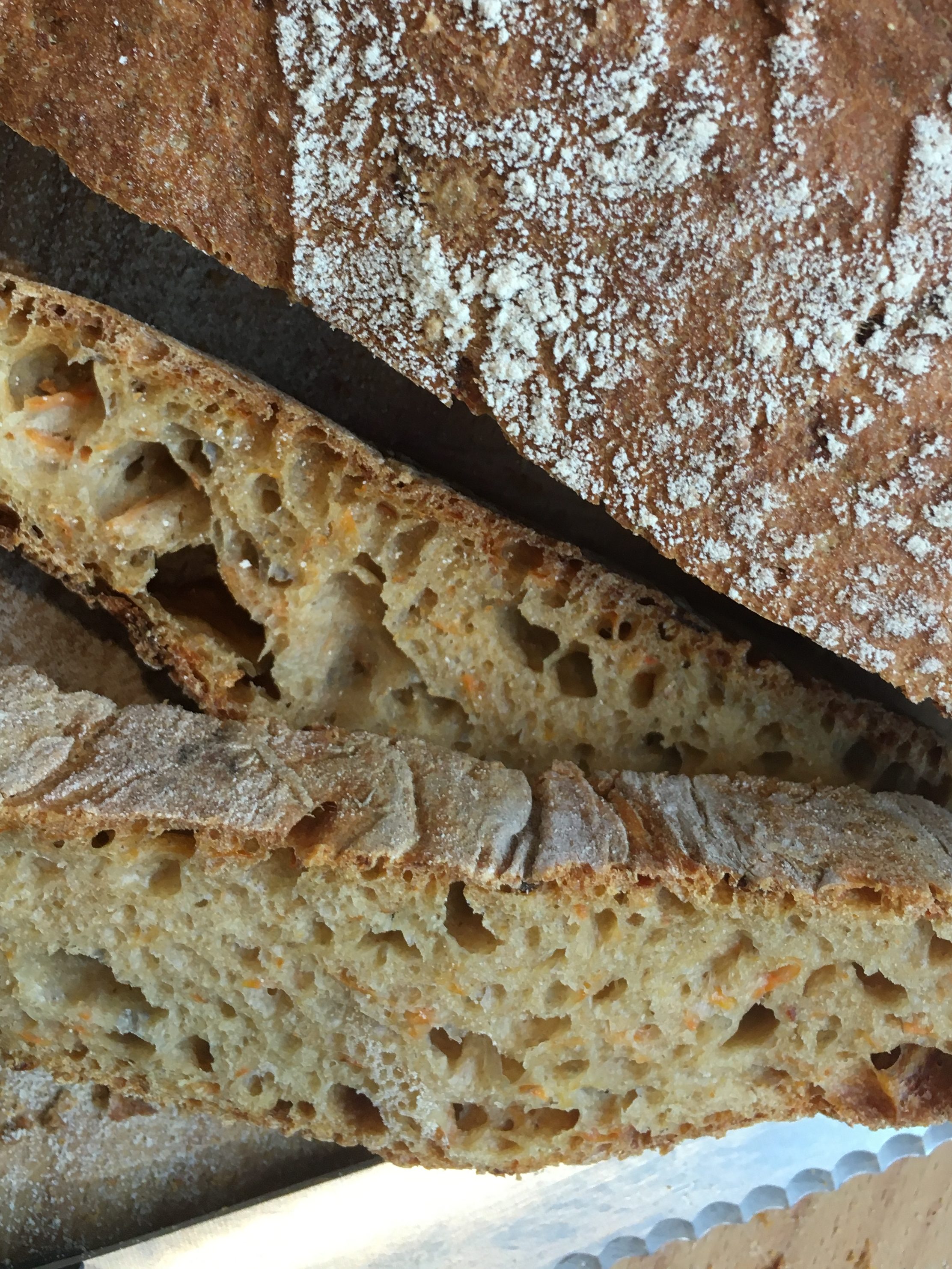 Zutaten: 190 g Möhren grob gerieben, 335 g Weizenmehl, 145 g Dinkelmehl, 315 ml Wasser, 12 g Salz, 0,4 g Hefe frisch; Möhren reiben und mit den anderen Zutaten zum Teig geben, 24 Stunden bei Zimmertemperatur reifen lassen, alle 8 Stunden dehnen und falten; in einem vorgeheizten Holzofen bei 180 Grad 1 Stunde backen