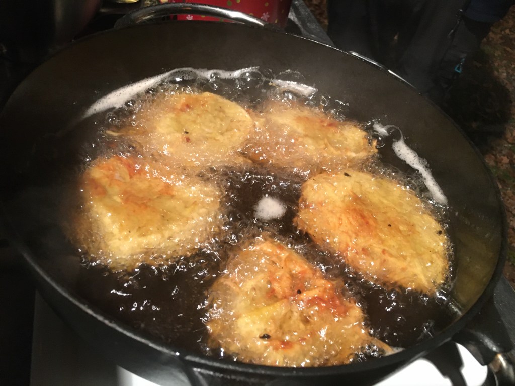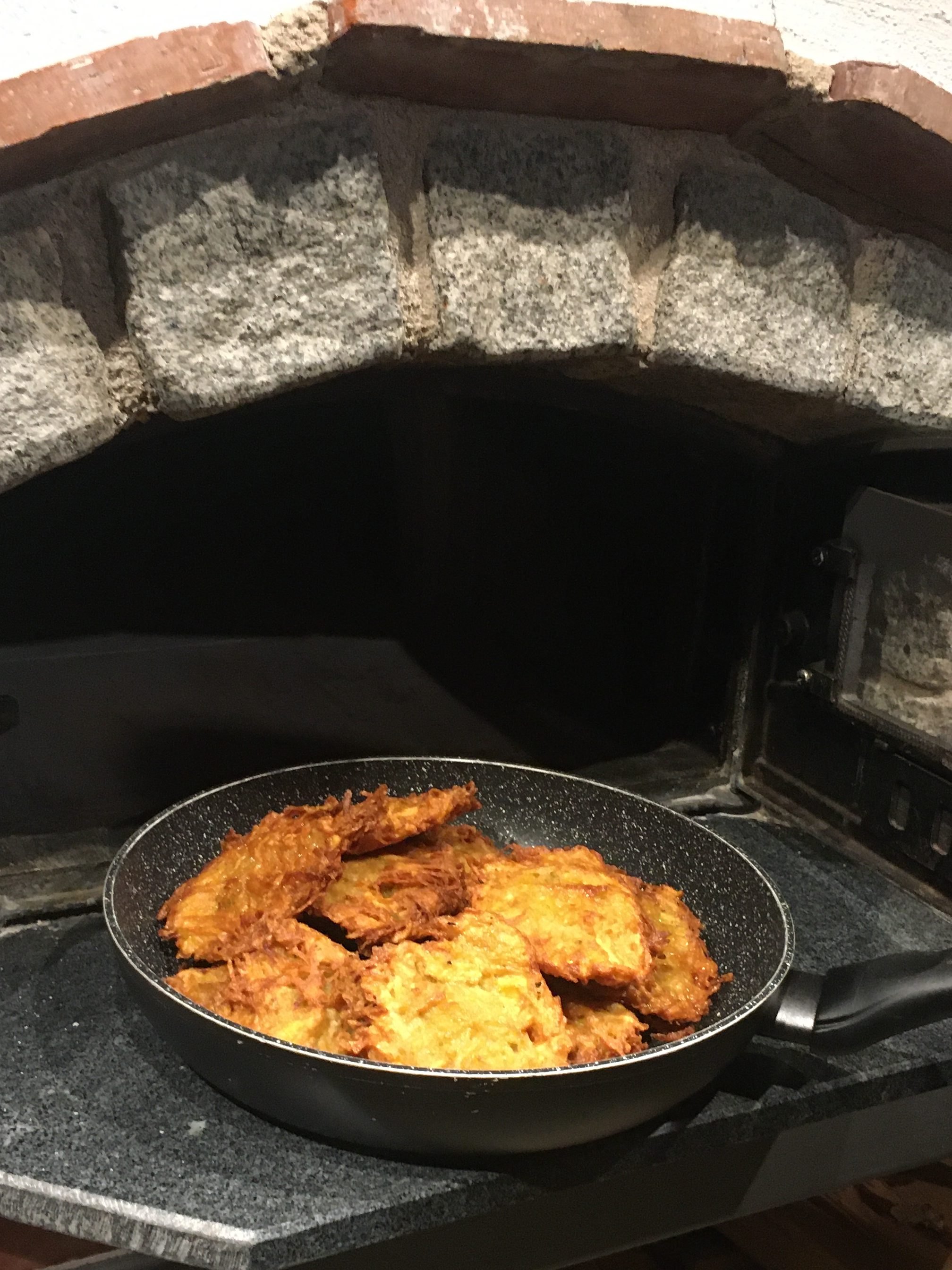Zutaten: 1 kg Kartoffeln grob reiben und die Flüssigkeit durch ein Tuch auspressen, 1 Ei, Salz, Mehl ca. 100 g; alle Zutaten vermischen, Plätzchen formen und in heißem Öl (ca. 180 Grad) frittieren