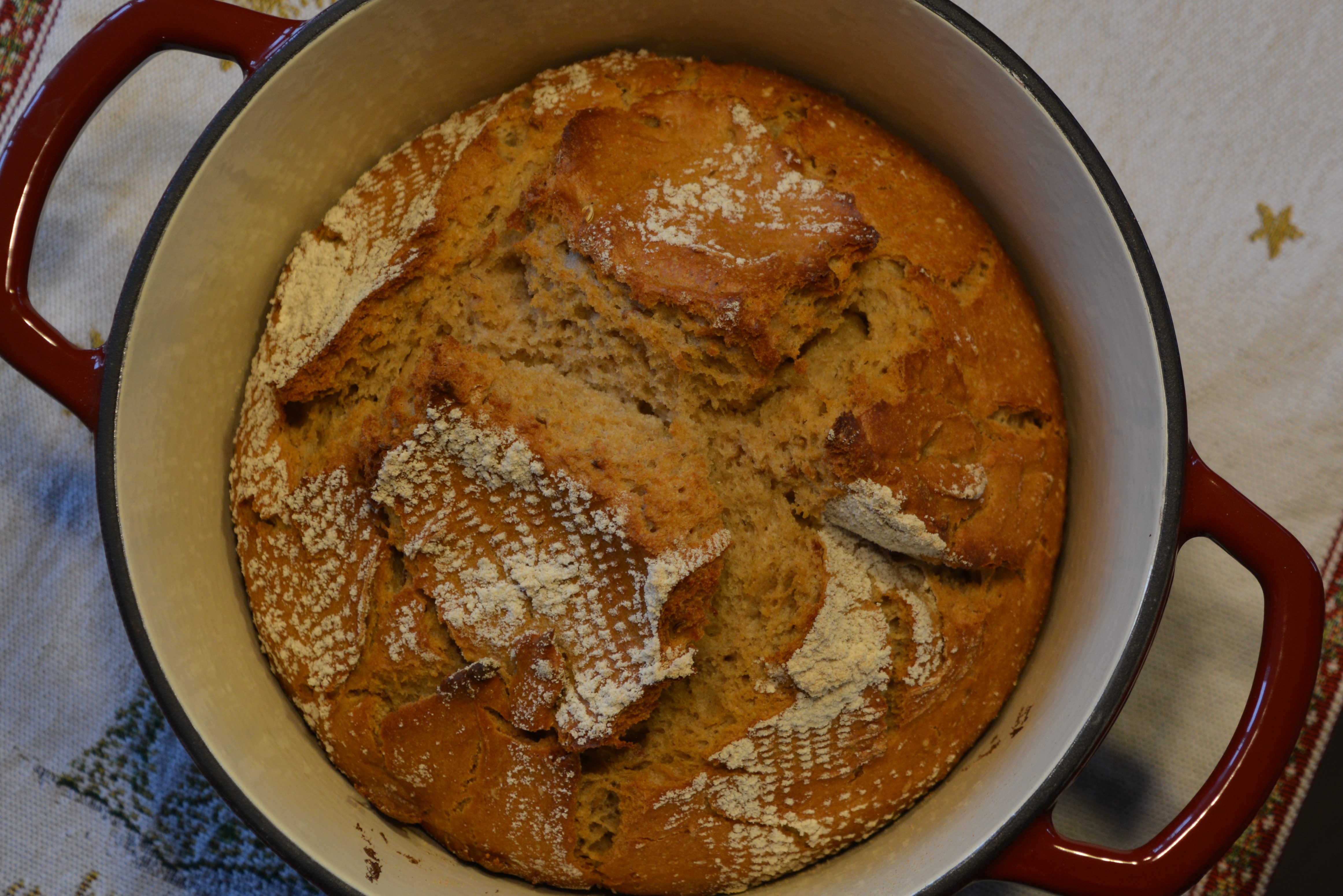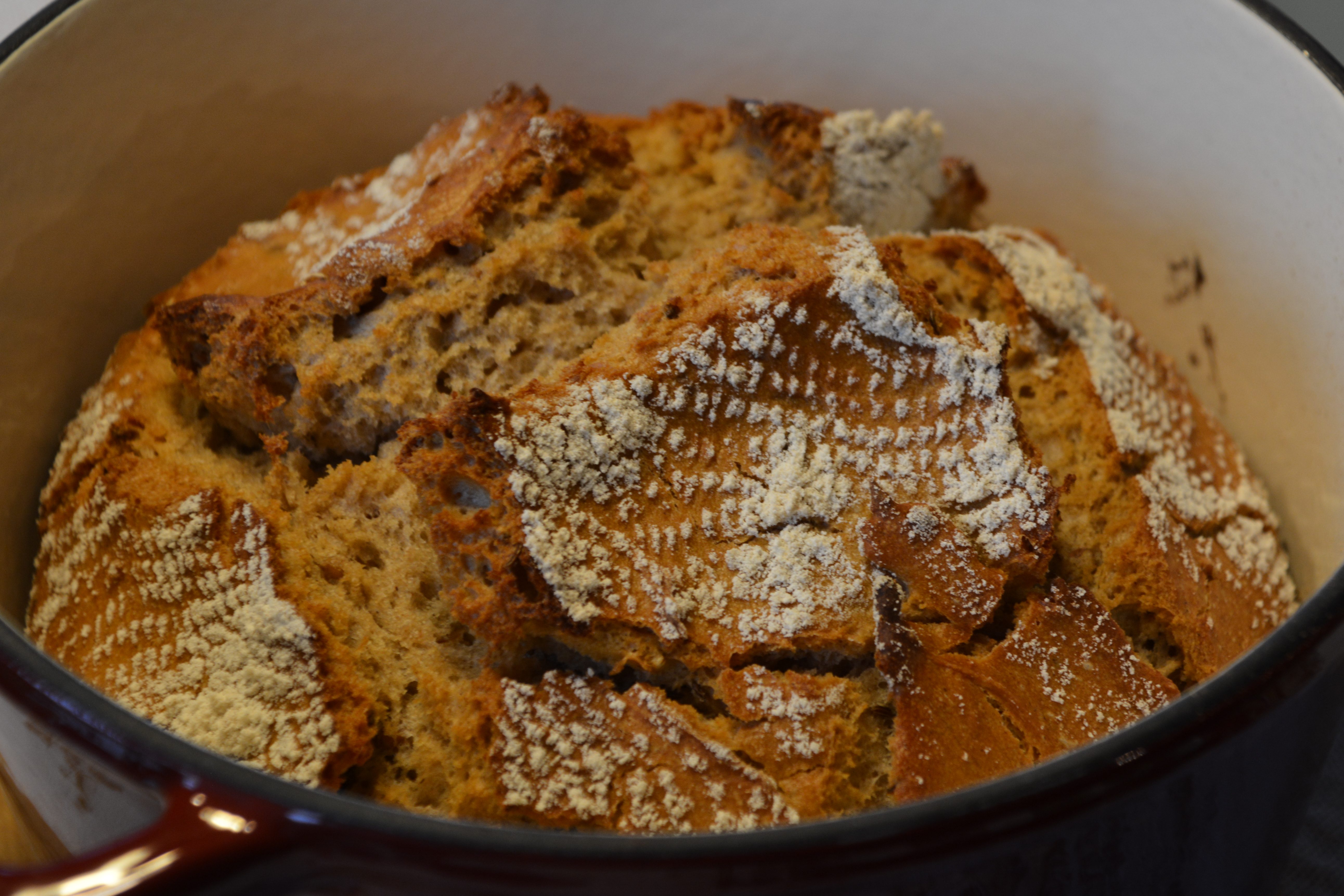 Zutaten: 180 g Mehlkochstück (30 g Dinkelvollkornmehl, 150 g Wasser, 12 g Salz), 350 g Dinkelvollkornmehl, 125 g Roggenvollkornmehl, 115 g Wasser, 0,3 g Hefe frisch, 200 g Joghurt (3,5% Fett), 15 g Essig; alle Zutaten zum Teig kneten, 24 Stunden reifen lassen, alle 8 Stunden dehnen und falten; bei 250 Grad 15 Minuten, danach bei 230 Grad 25 Minuten in einem vorgeheizten Backofen in einem gusseisernen Topf backen