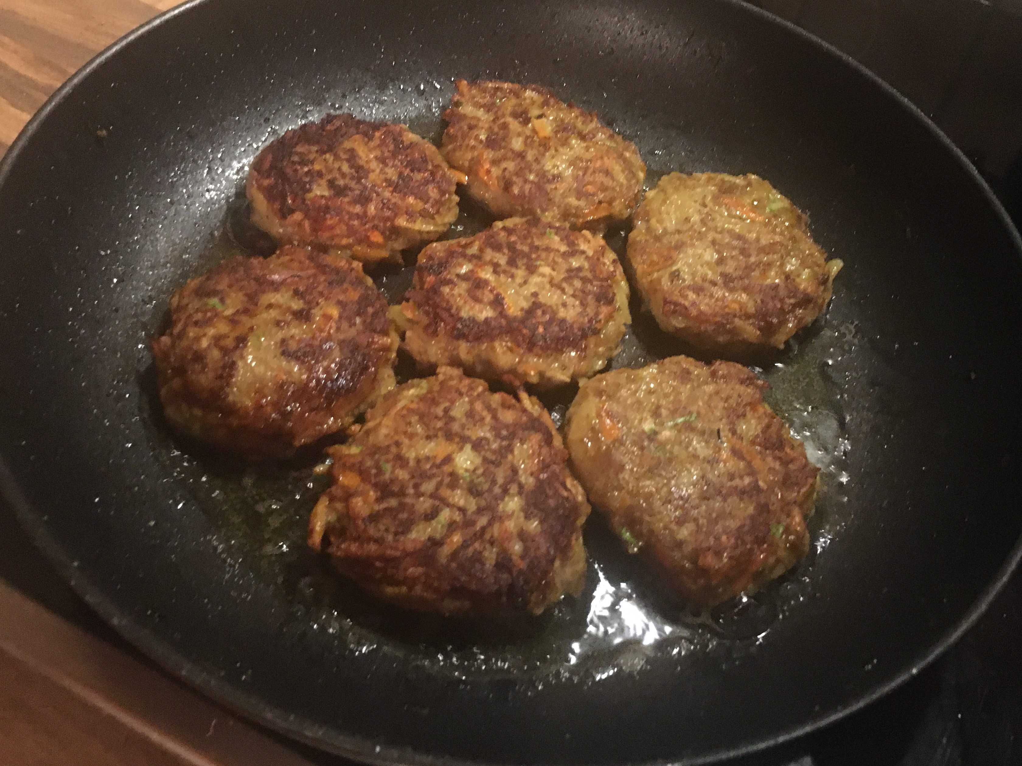 Zutaten: 200 g Hackfleisch, 1 Zwiebel, 10 g Ingwer, 400 ml Öl, 600 g Kartoffeln, 200 g Karotte, 200 g Zucchini, 2 Eier, 1 Handvoll Koriander oder Petersilie, 2 EL Weizenmehl, 1 EL Kurkuma, 1/2 TL Zimt, 1/2 TL Kümmel, Salz, Pfeffer; Zwiebel und Ingwer fein raspeln und mit Fleisch kneten; Kartoffeln, Karotte, Zucchini raspeln; Koriander fein hacken; alle Zutaten vermischen, würzen; kleine Portionen (ca. 75 g) formen und von beiden Seiten anbraten