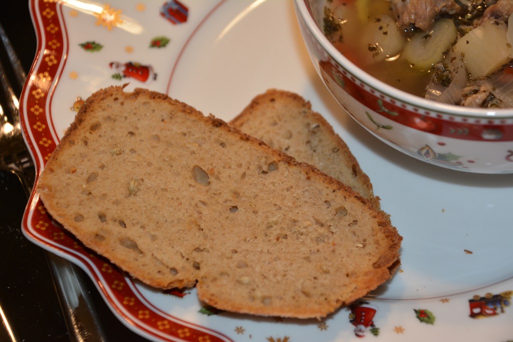 Zutaten: 180 g Mehlkochstück (), 550 g Dinkelvollkornmehl, 235 g Wasser, 25 g Zitronensaft, 0,3 g Hefe frisch, Koriander beliebig; den Teig kneten und 24 Stunden reifen lassen, alle 8 Stunden dehnen und falten; bei 250 Grad 15 Minuten, danach bei 230 Grad 15 Minuten in einem vorgeheizten Backofen in einem gusseisernen Topf backen