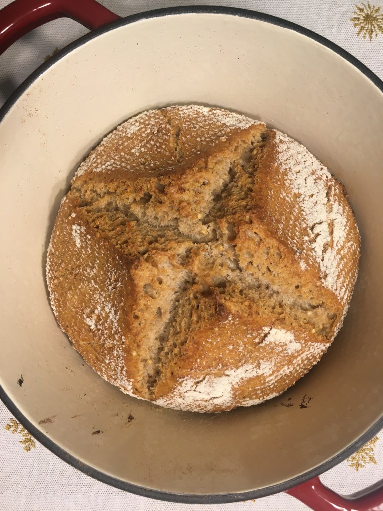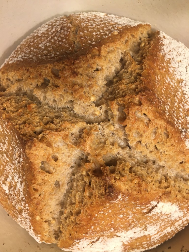 Zutaten: 365 g Weizenmehl 550, 425 g Wasser, 12 g Salz, 0,5 Hefe frisch, 200 g Haferflocken, Koriander beliebig; den Teig zubereiten, 24 Stunden reifen lassen; alle 8 Stunden falten und dehnen; bei 250 Grad 15 Minuten, danach bei 230 Grad 20 Minuten in einem gusseisernen Topf in einem Backofen backen