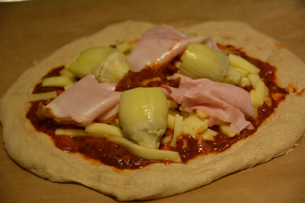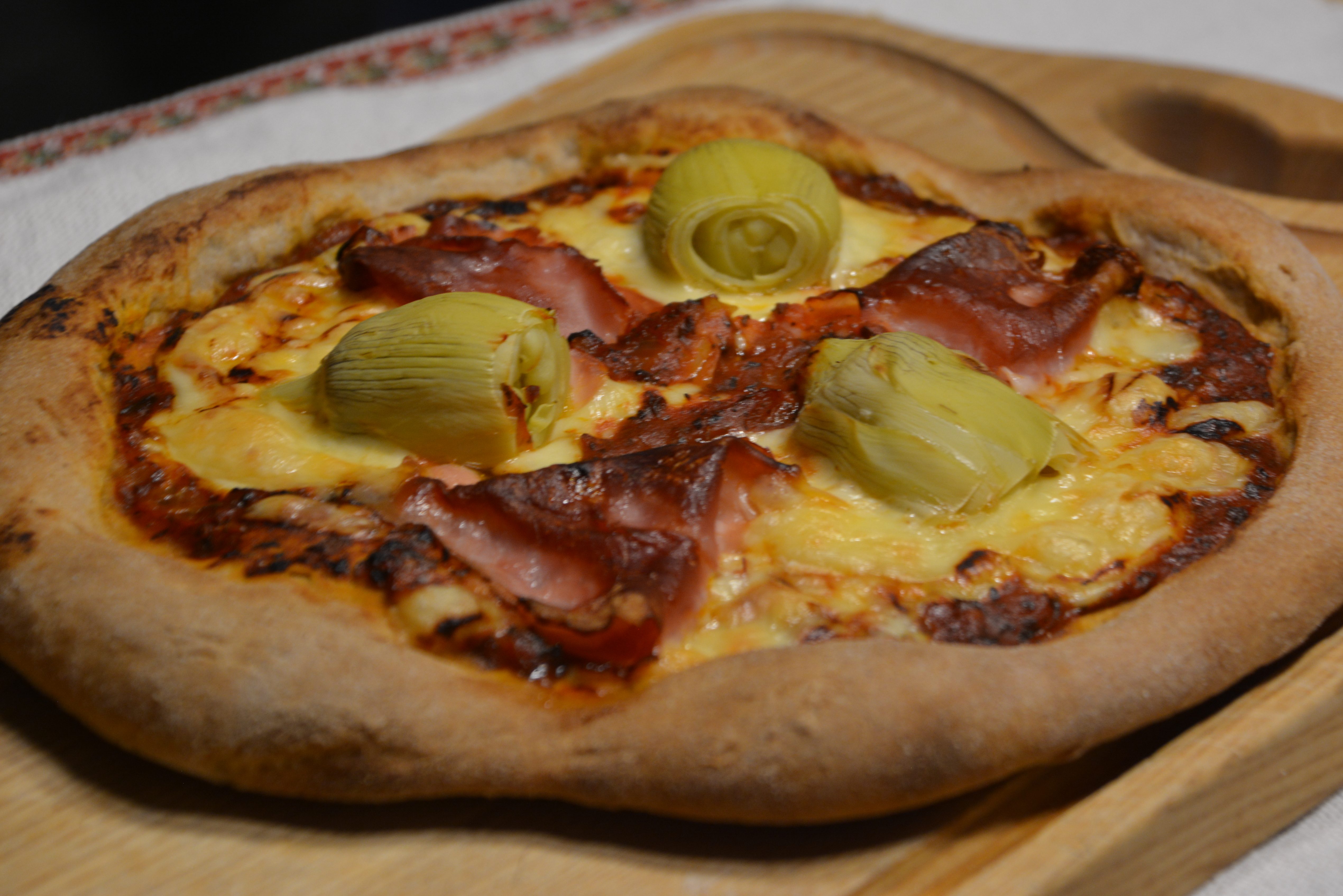 Zutaten: für 2-3 Bleche; 575 g Weizenmehl, 390 g Wasser, 12 g Salz, 0,4 g Hefe (frisch), 25 g Olivenöl; alle Zutaten zusammen kneten, den Teig 24 Stunden reifen lassen, alle 8 Stunden dehnen und falten; die Teiglinge ausrollen, ausziehen, in einem vorgeheizten Backofen auf einem Backstein oder einer gusseisernen Platte bei 250-280 Grad Ober/Unterhitze 10-15 Minuten backen