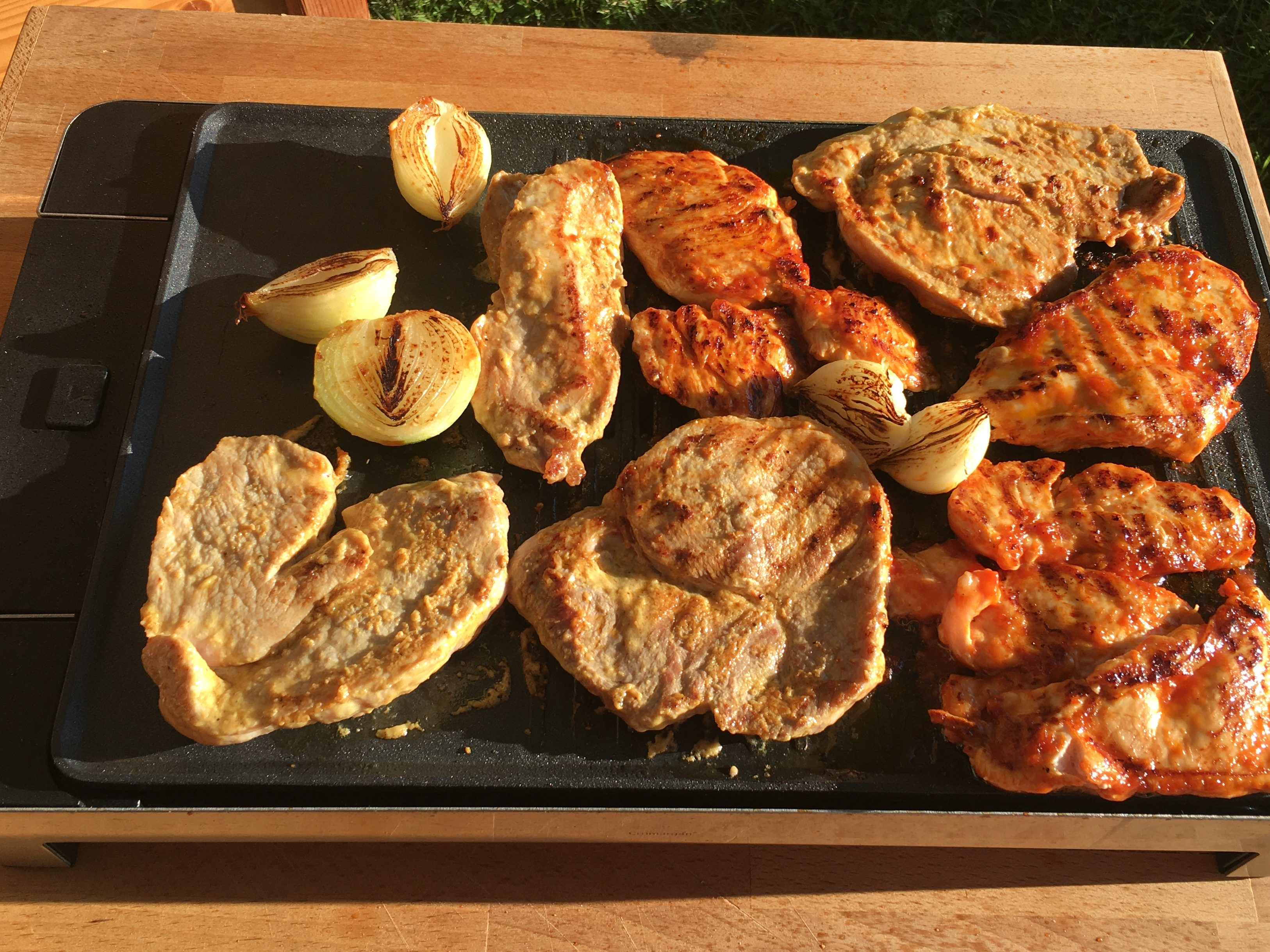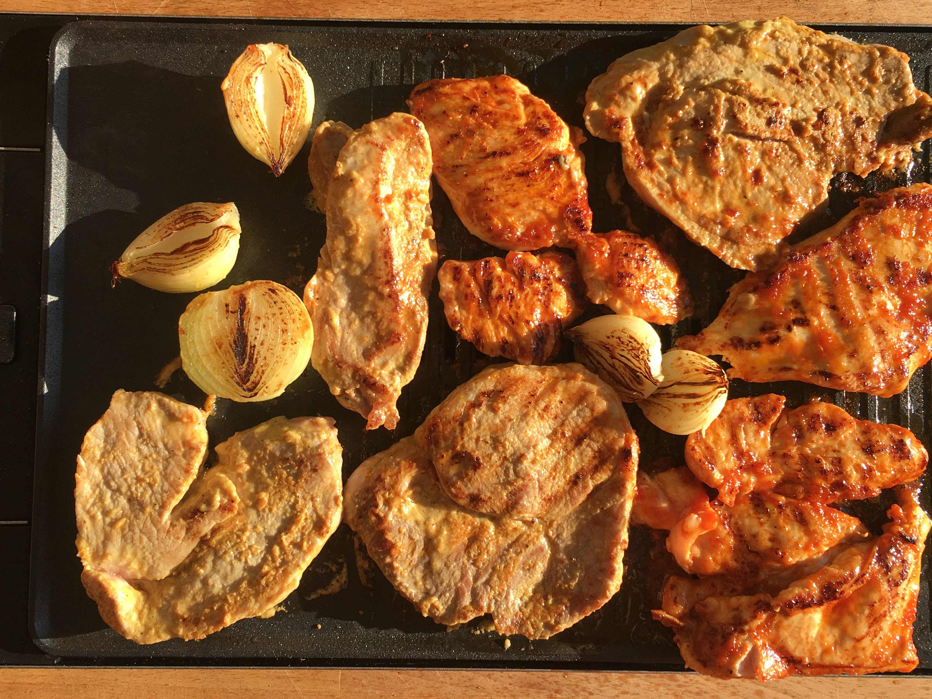 Zitaten: Marinade fürs Schweinefleisch: Dijon Senf 3 EL, 50 ml Olivenöl, Salz, Pfeffer; Marinade fürs Hähnchenfleisch; 3 EL Ketchup, 50 ml Olivenöl, Salz, Pfeffer