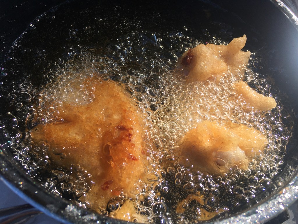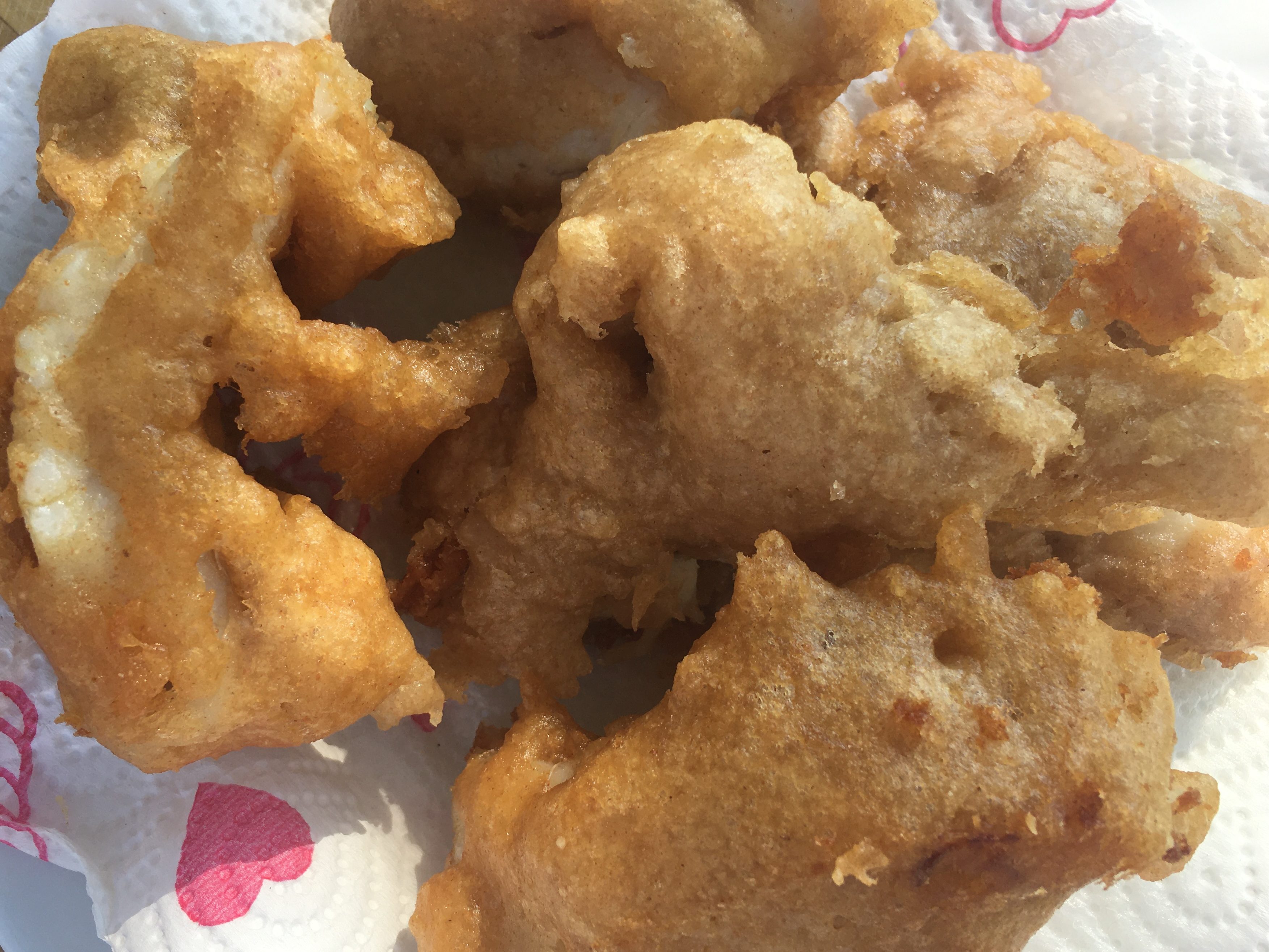 Zutaten: Mehl (400 g) 10 Minuten einfrieren, mit Backpulver (3 TL), etwas Salz, 550 ml Franziskaner verrühren, den dickflüssigen Teig kalt stellen; Frittieröl in einem Topf auf 160-170 Grad erhitzen. Kabeljau-Filets in ca. 8 cm große Stücke schneiden, mit Salz, Pfeffer würzen, portionsweise durch den kalten Bierteig ziehen und im heißen Öl ca. 4 Minuten ausbacken, auf Küchenpapier abtropfen lassen.