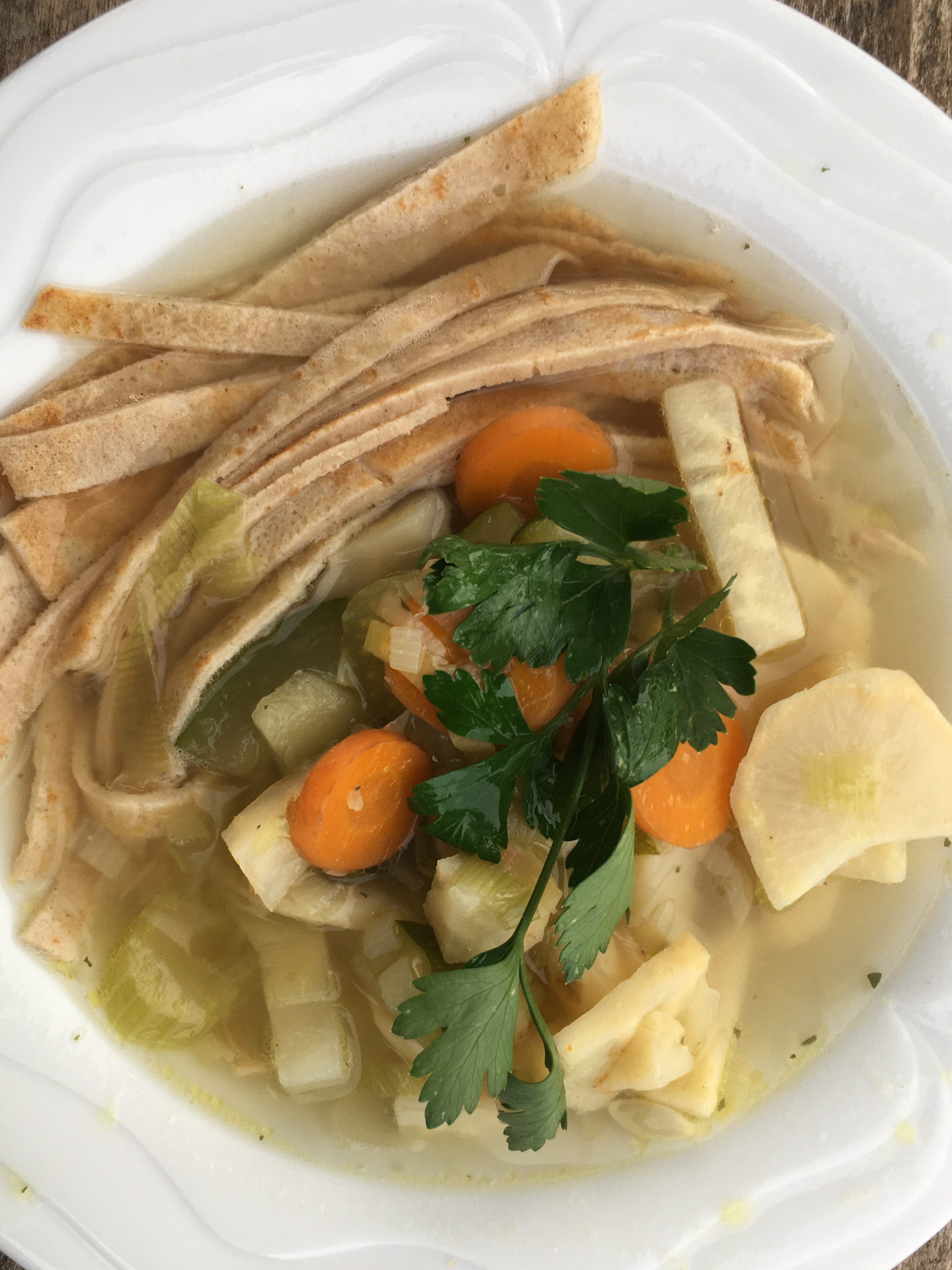 Zutaten: Sommergemüse (ich hatte 1 Stange Porree, 1 Stange Sellerie, 1 Wurzelpetersilie, 1 Möhre, 1 Kopf Sellerie, 1 Zucchini) in Olivenöl andünsten, im 1,5 l Wasser oder Brühe 20 Minuten köcheln, mit Salz und Pfeffer abschmecken, mit frischer Petersilie uns in Streifen geschnittenen Dinkel-Pfannkuchen ( Teig ohne Zucker) servieren.