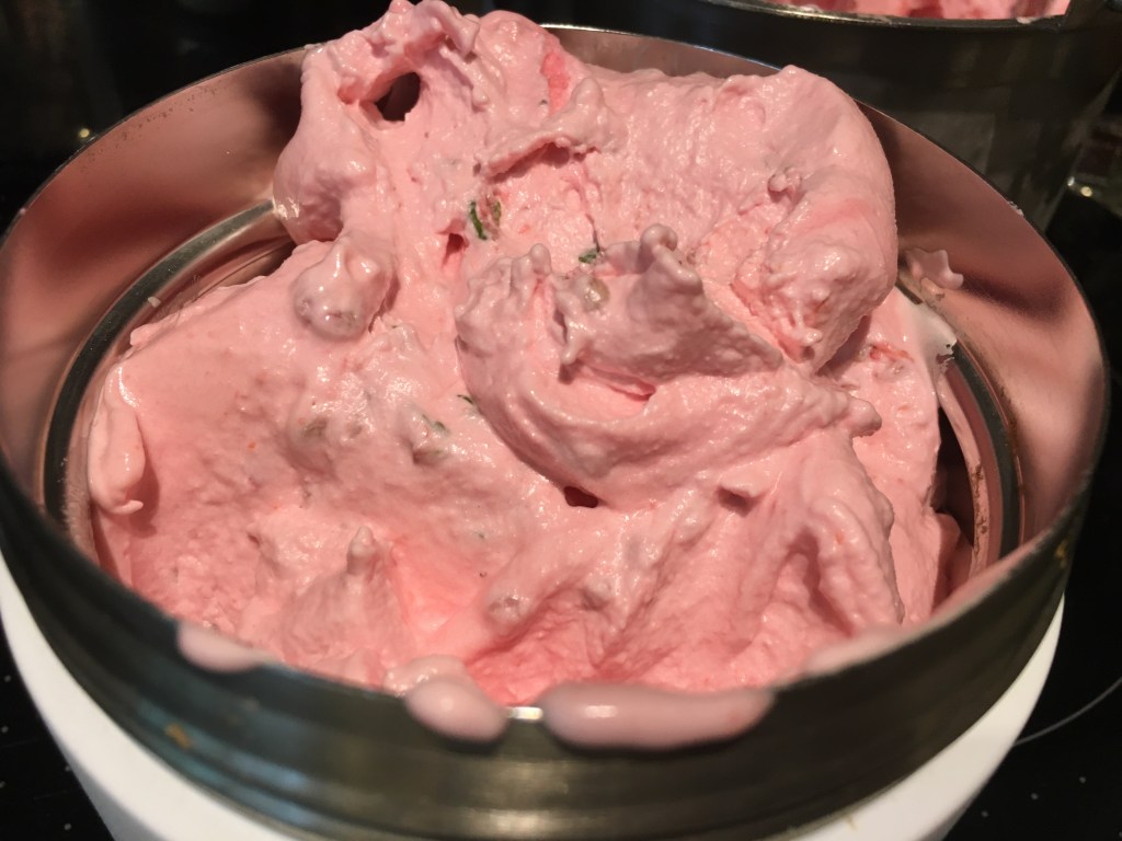 Zutaten: 200 g Beeren durch Flotte Lotte durchsieben, 100 g Zucker und 50 ml Weißwein dazu geben, kurz aufkochen, abkühlen; Eischnee aus 1 Eiweiß und 100 g Zucker unterheben, beliebig viel Koriandergrün ergänzen, 60 Minuten in einer Eismaschine zum Sorbet verarbeiten (ich benutze Springlane Elli)