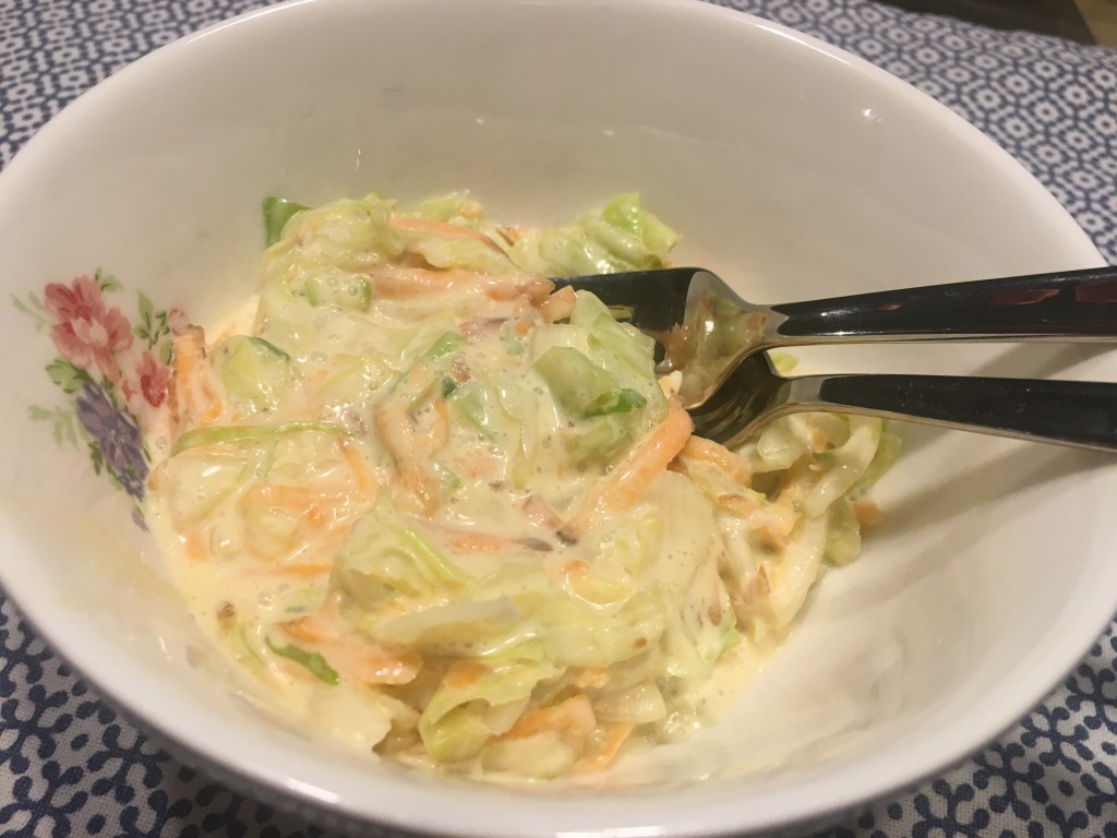 Zutaten: 1 Kopf Weißkohl, 250 g Möhren gerieben, 2 Zwiebeln; Marinade: 250 ml Sahne, 1 Becher Creme fraiche, 4 EL Mayonnaise, 2 EL weißer Essig, 2 EL Senf, 2 EL Zucker; 2-3 EL grobes Salz; das Kraut fein hobeln und mit Salz vermengen, die Mischung 1 ½ Stunden stehen lassen um dem Weißkraut die Flüssigkeit zu entziehen; mit Möhren und Zwiebeln vermischen; die Marinade übergießen, kalt stellen, mindestens 1 Tag reifen lassen.