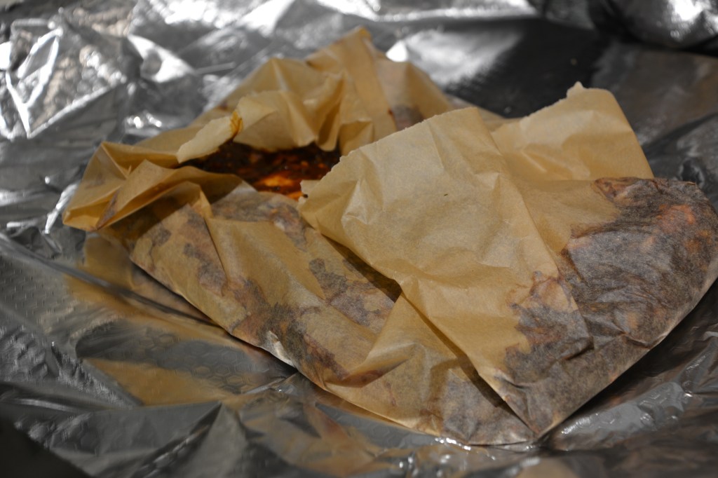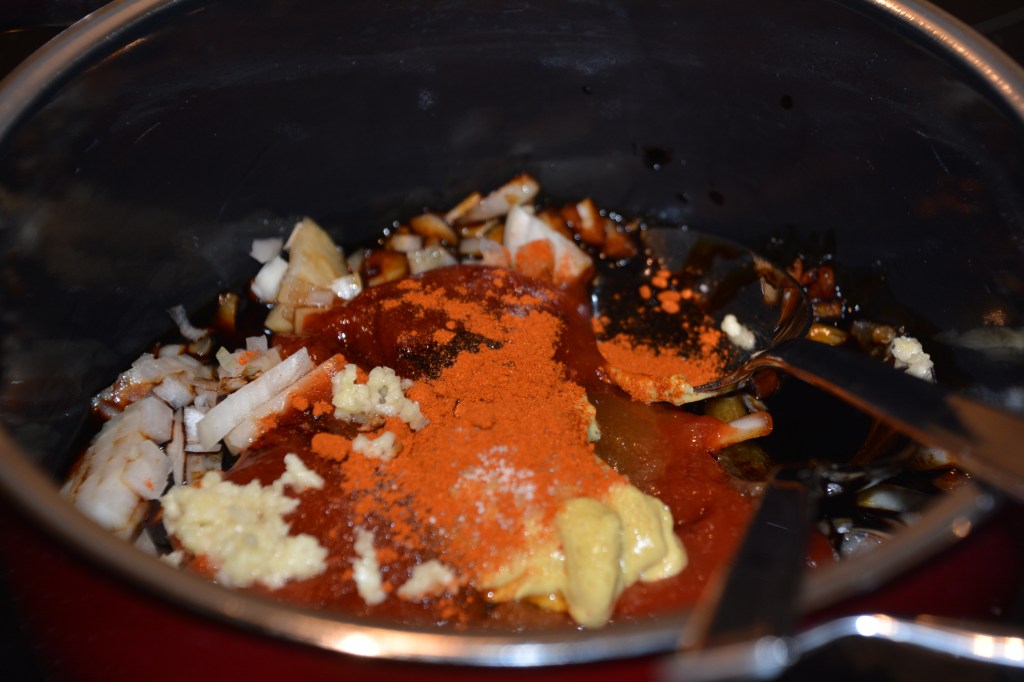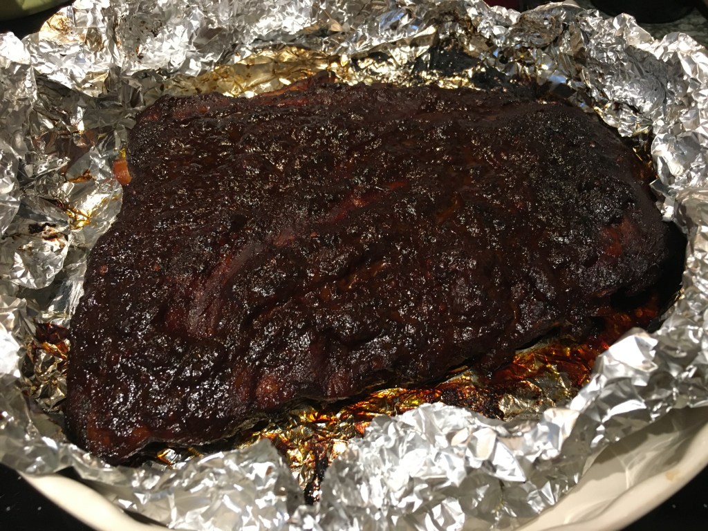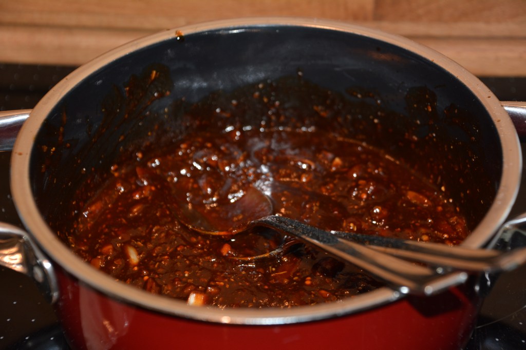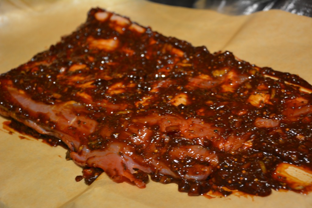 Alle Marinade-Zutaten 10 Minuten köcheln lassen, bis eine cremige Konsistenz entstanden ist. Alufolie und Backpapier ausbreiten. Die Marinade rundherum auf dem Fleisch verteilen. Die Alufolie dicht verschließen. 3-4 Stunden bei 130 Grad im vorgeheizten Holzofen schmoren. Anschließend die obere Alifolie abnehmen und das Fleisch auf der obersten Schiene im Backofen bei 250 Grad mit der Grill-Funktion oder auf dem Grill noch 10 Minuten grillen