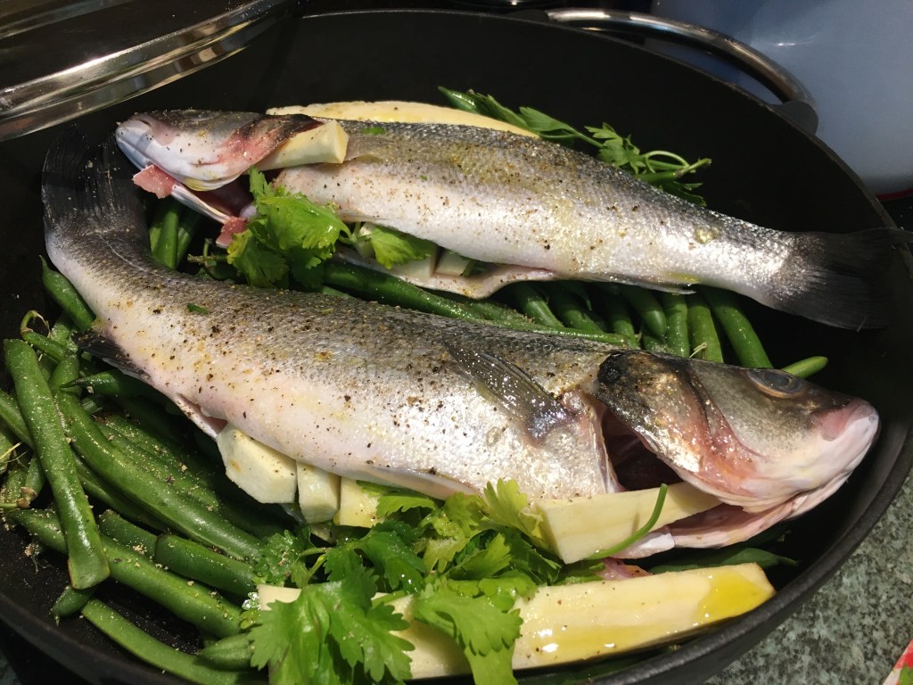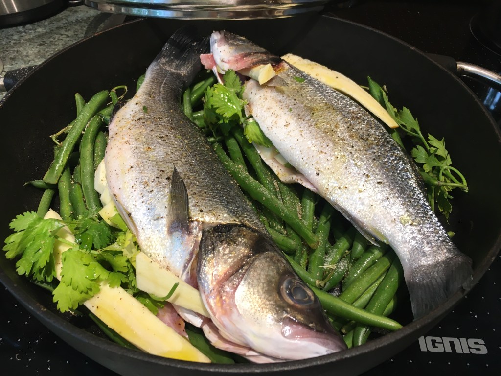 Zutaten: 2 Fische, küchenfertig, 400 g junge Bohnen, 2 Knoblauchzehen, 1 Pastinake, Koriandergrün, Olivenöl, 250 ml Weißwein, Salz, Pfeffer; den Fisch würzen, mit Knoblauch, Pastinake, Koriander füllen; den Ofen auf 180-160 Grad Grad vorheizen; eine Form mit Bohnen auslegen, den Fisch auf Bohnen legen, das Olivenöl darüberträufeln; 15 Minuten backen, danach Weißwein angießen, noch 30 Minuten schmoren; in der Form servieren.