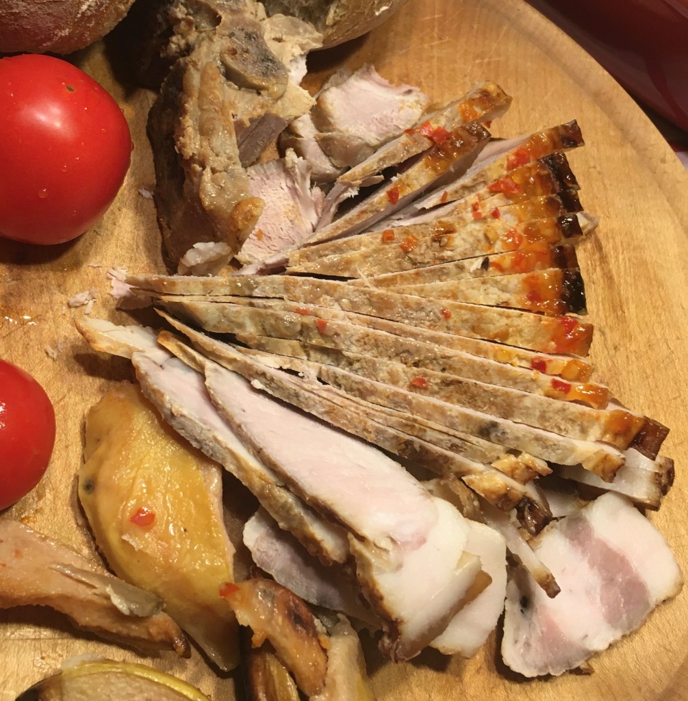 Zutaten: Kotelett (Schwein) scharf in Öl anbraten, würzen, 2 Quitten (grob geschnitten) dazu geben und kurz zusammen dünsten, ich hatte noch 2 EL süß-sauer-Soße über dem Fleisch verteilt; das Fleisch mit Quitten uns 100 ml Weißwein in einem Backofen 1 Stunde bei 130 Grad schmoren lassen. Kalt servieren.