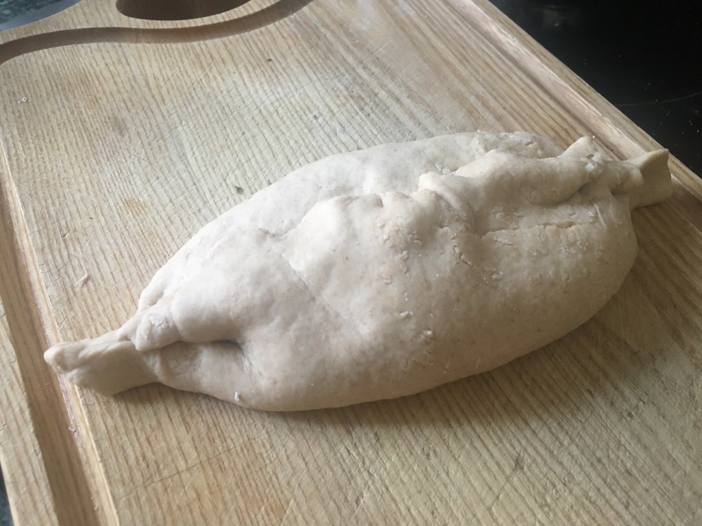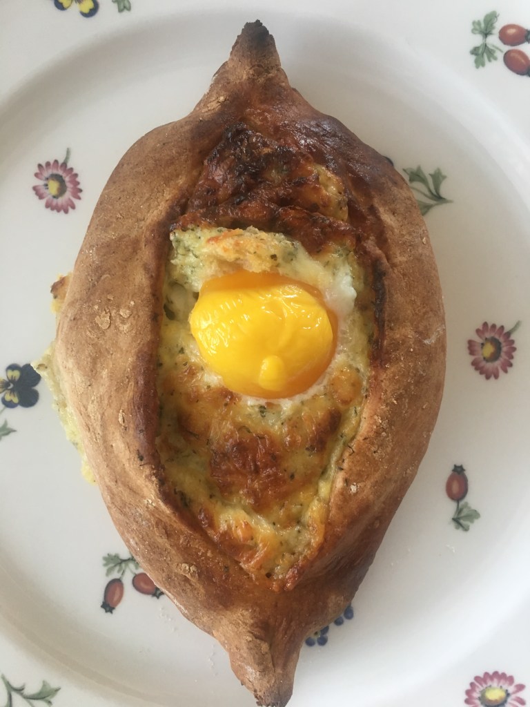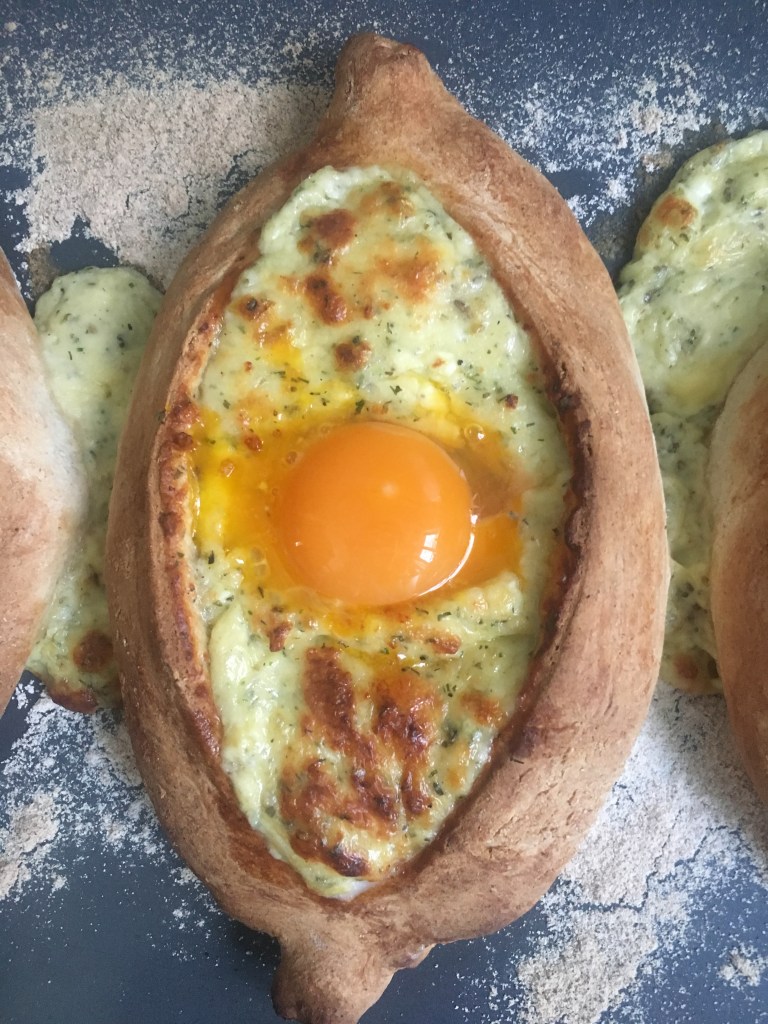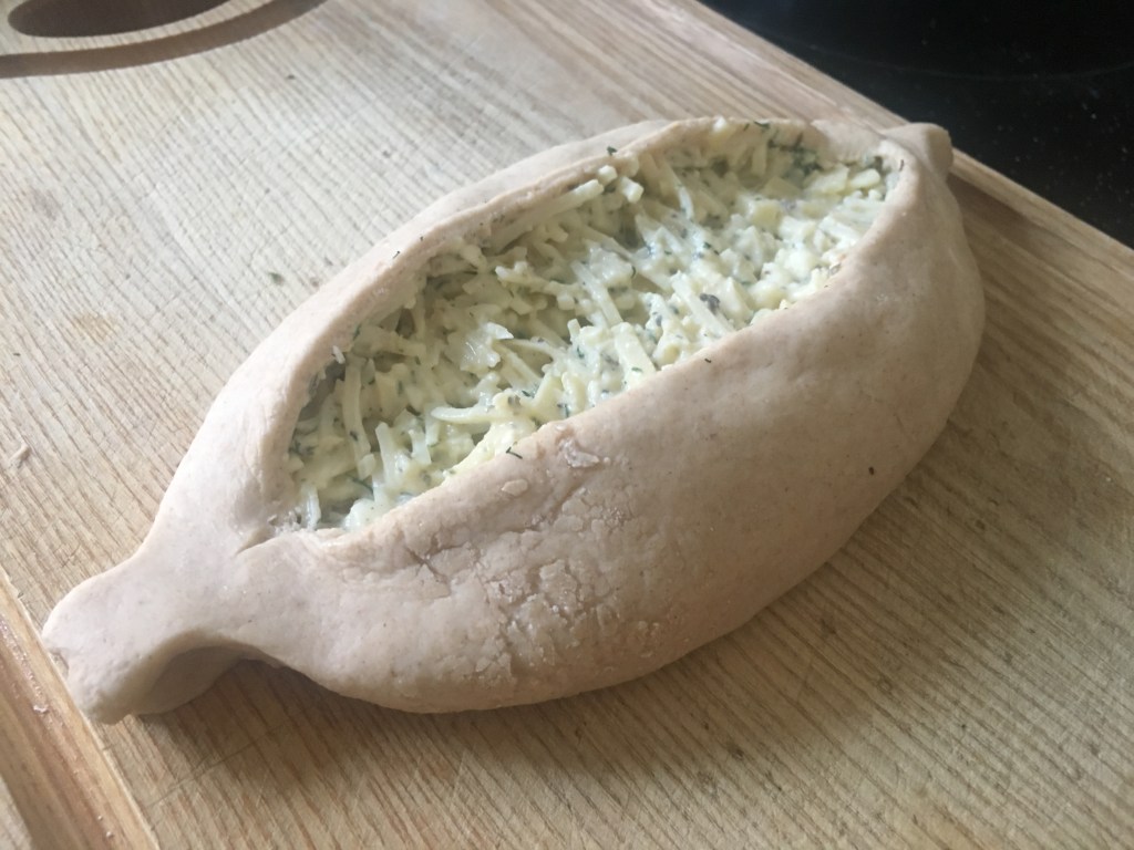 Zutaten: Teig: 10 g Hefe, 2 EL Zucker, 200 ml Wasser, 450 g Mahl (ich habe Dinkel-Mehl gehabt), Salz, die Teig-Menge soll sich verdoppelt; Füllung: 100 g Quark (ich hatte körnigen Frischkäse), 250 g Edamer, 250 g Cheddar (es würde alle Käse-Sorten passen, die über 40% Fellanteil besitzen), 1 Ei, Eier für jedes Schiffchen (ich habe die Hälfte der Portion gemacht-daraus entstanden 3 Chatschapuri), viel Kräuter, beliebig; Backen in einem sehr heißen Ofen (bei 250 Grad) 10 min, danach über jedem Schiffchen ein Ei aufschlagen und noch 5 min weiter backen (bei 200 Grad)