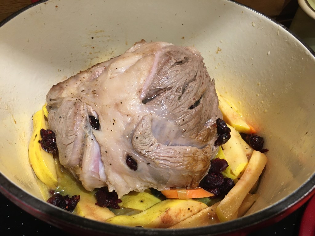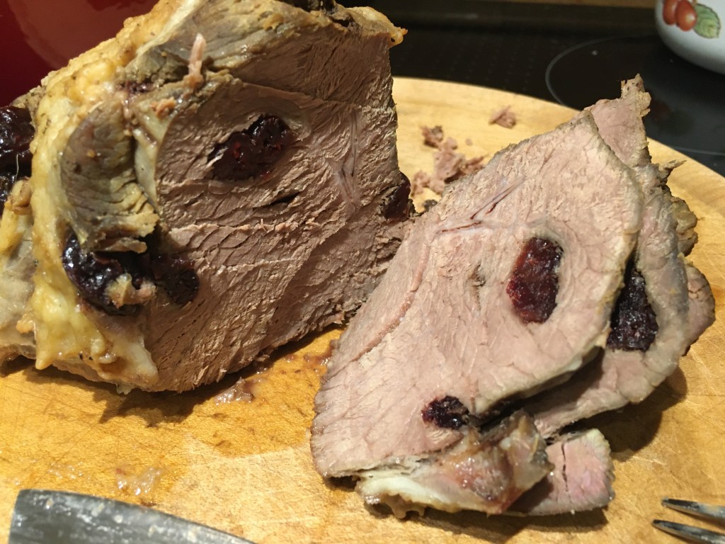 taten: Das Lamm-Fleisch (500 g) mit Moosbeeren spicken, 1-2 Stunden marinieren (Olivenöl, Salz, Pfeffer), scharf in Öl anbraten, die Früchte (3 Quitten, 6 Feigen, Moosbeeren beliebig, sowie 1 Möhre) schneiden, zum Fleisch geben, zusammen kurz anbraten, mit Apfelwein (200 ml) ablöschen, im vorgeheizten Backofen 90 Minuten bei 150 Grad (Ober und Unterhitze) schmoren, kalt servieren.