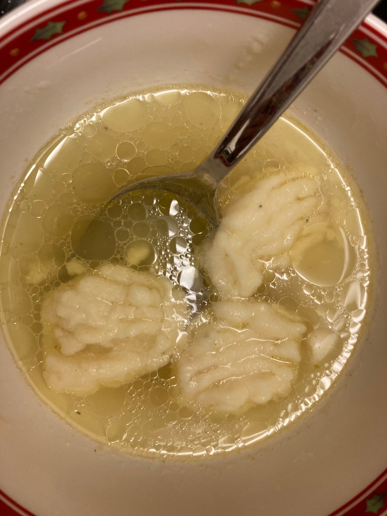 taten: 500 ml Gemüsebrühe, Salz, Pfeffer, 110 g Weichweizengrieß, 1 Ei; Brühe erhitzen, in die heiße Brühe Salz, Pfeffer und Grieß geben, unter ständigem Rühren auf mittlerer Hitze einen Brandteig herstellen – der Grieß soll mit der Brühe einen festen Teig ergeben, welcher sich leicht vom heißen Topfboden löst. Den Topf vom Herd nehmen, in die heiße masse das Ei mit einem Holzlöffel einarbeitend das Ganze abgedeckt 30 Minuten auskühlen lassen. Einen Topf mit leicht gesalzenem Wasser zum Sieden bringen. Den ausgekühlten Teig in eine Hand nehmen und mit einem Teelöffel kleine Klöße abstechen und direkt ins heiße Wasser gleiten lassen. Kommen alle Klöße nach oben, können sie mit einer Schaumkelle herausgenommen und warm in einer Suppe serviert werden.