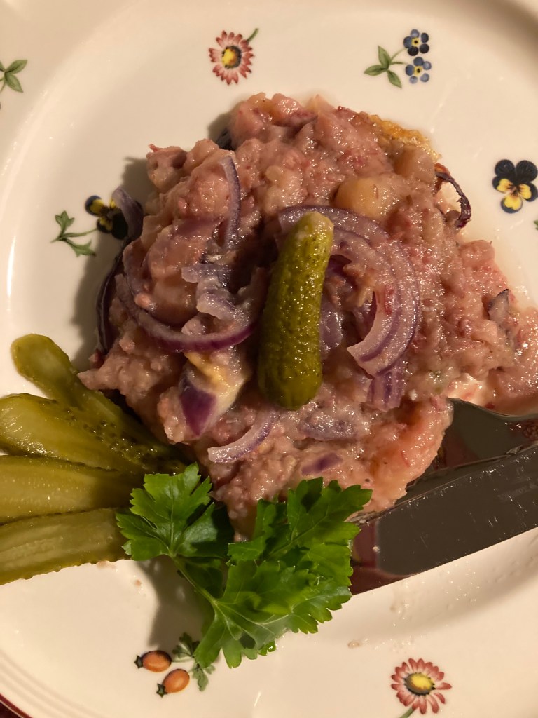 Zutaten:1 kg gepökeltes Rindfleisch, 3 Gemüsezwiebeln, 1 kg mehligkochende Kartoffeln, 700 g Rote Bete (gekocht), 700 g Gewürzgurken, 200 g Schmalz, 2 EL Senf, Pfeffer, Salz, Lorbeerblätter, Gewürznelken, 1 Bund Suppengemüse; das Fleisch mit Suppengemüse, einer Zwiebel, Lorbeerblättern, Gewürznelke, Pfefferkörnern in einem Topf mit kaltem Wasser bedeckt zum Kochen bringen; 1,5 Stunden kochen; das Fleisch soll sehr zart werden; die Kartoffeln schälen und gesalzen gar kochen; die Hälfte Rote Bete und Gewürzgurke als Beilage zur Seite stellen, die andere Hälfte getrennt durch einen Fleischwolf mit einer groben Scheibe wolfen; die restlichen Zwiebeln klein würfeln; das Fleisch aus der Brühe nehmen und wolfen; die Brühe durch ein feines Sieb gießen; in einem Topf das Schmalz erhitzen und darin die Zwiebeln anschwitzen; dazu gewolfte Fleisch, Rote Bete, Gurken geben und mit Gewürzgurkenfond und einem Teil der Kochbrühe auffüllen und alles unter ständigem Rühren erwärmen, dabei muss eine dünnflüssige Konsistenz entstehen; in die Mischung die gekochten Kartoffeln mit einer Kartoffelpresse hineinpressen und unterrühren; mit Self, Pfeffer, Salz abschmecken; warm servieren.