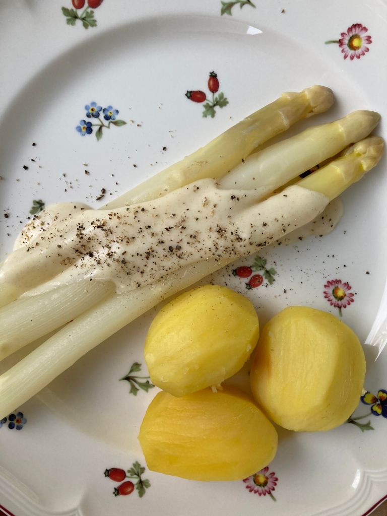 Zutaten: 500 g weiser Spargel (geschält), 50 g Butter, Salt, 3 EL Zucker, 30 g Mehl, Sahne, Pfeffer, Muskat; in einem großen Topf etwas 2-3 L mit Salz, Zucker und 20 g Butter aufkochen; bei mittlerer Hitze den Spargel 6-8 Minuten kochen; Spargelfond aufbewahren; 30 g Butter bei mittlerer Hitze schmelzen, Mehl dazu geben, glatt rühren, zur Mehlschwitze schluckweise den Fond hinzufügen, mit Schneebesen glatt mischen; etwas Sahne unterrühren; die Soße aufkochen und mit Salz, Pfeffer, Muskat abschmecken.
