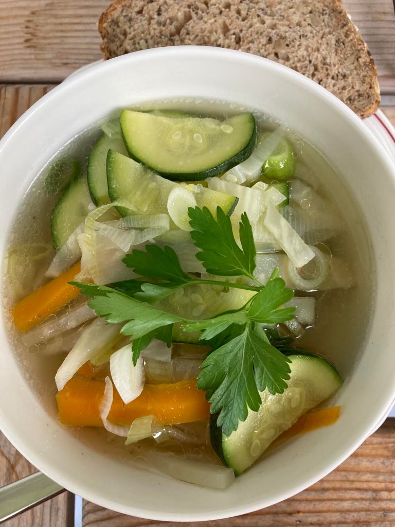 Zutaten: 1 kg Hohe Rippe, 1/2 Kopf Sellerie, 2 Möhren, 1 Stange Porree, 2 Stangen Frühlingszweibeln, 1 Zucchini, 2 l Wasser, Salz, Pfeffer, Lorbeerblatt, 2-3 Nelken; das Fleisch langsam (ca. 2 Stunden) köcheln, würzen, aus der Brühe rausnehmen, in kleinen Stücken schneiden; in der Brühe zuerst Porree, Möhren, Sellerie (klein geschnitten) 10 Minuten köcheln, danach – zusammen mit Zwiebeln, Zucchini und Fleisch; nachwürzen, mit Buchweizenmehl (2 EL) andicken; servieren.