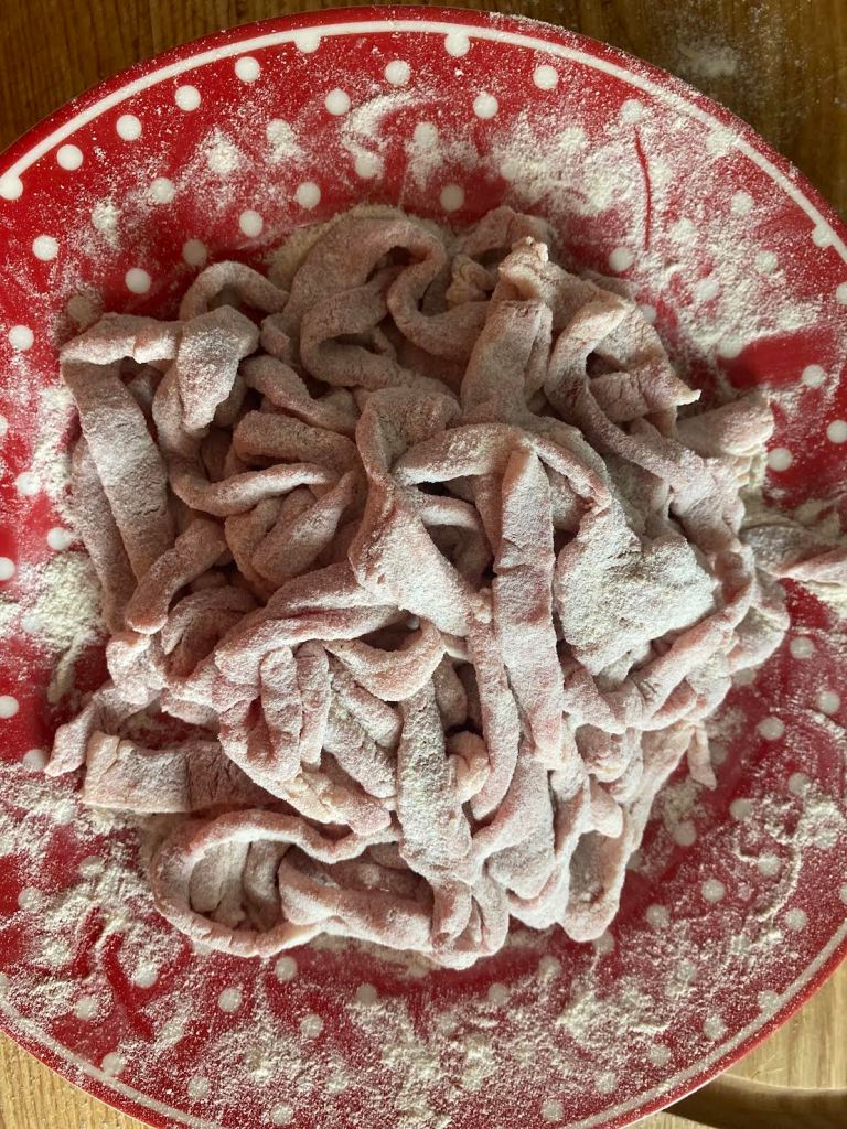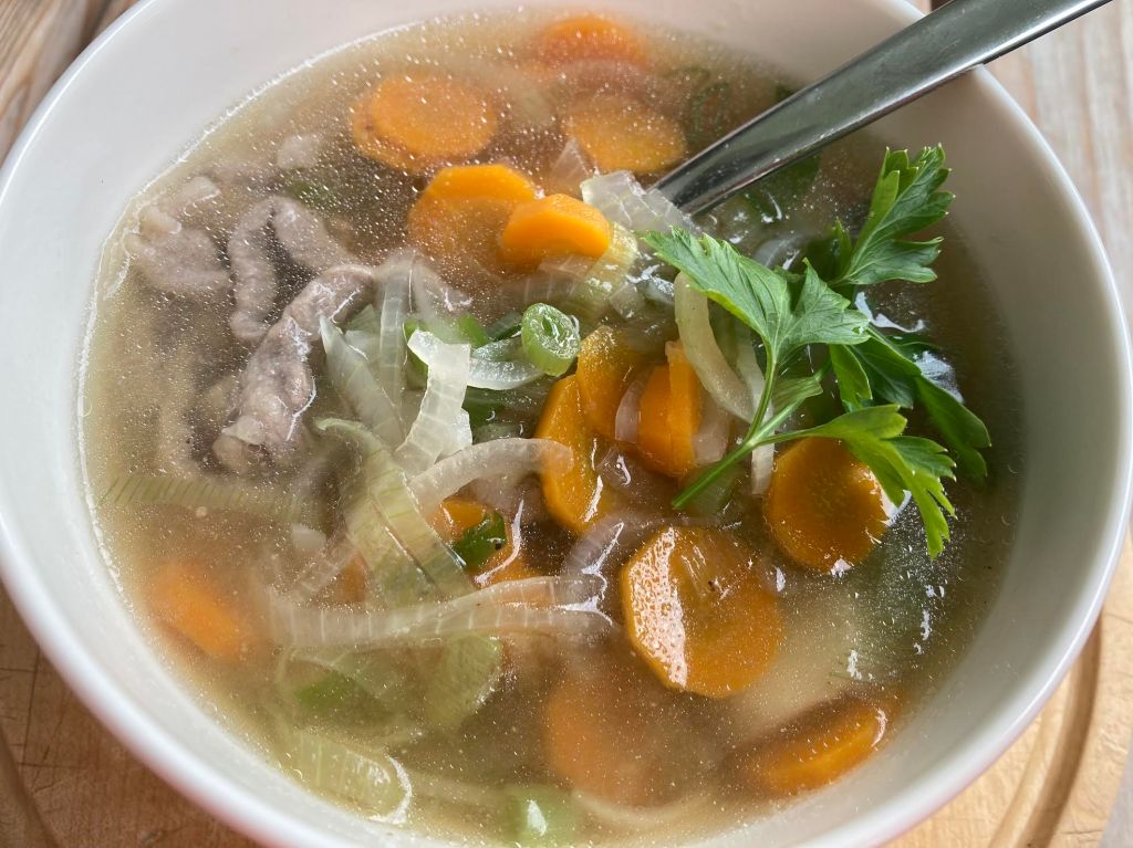 Zutaten: Rinderfilet ca. 200 g dünn (3 mm dick) in streifen schneiden; durch Buchweizen-Mehl durchziehen; in kochendem gesalzenem Wasser 2 Minuten kochen, rausnehmen, zur Seite stellen; in der Brühe etwas Gemüse (Möhre, Zwiebeln, Frühlingszwiebel) kurz köcheln, mit Fleisch-Nudeln vermischen, als Suppe servieren.