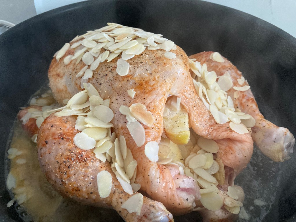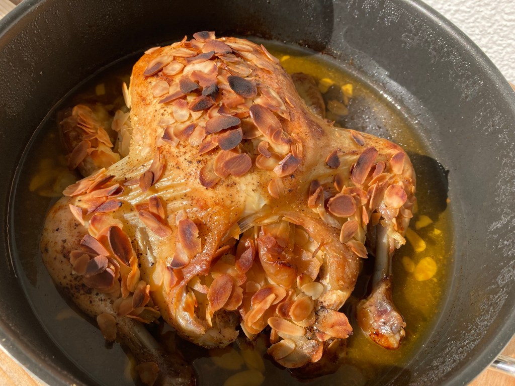 Zutaten: 1 Huhn, 2 Äpfel, 100 g blättrige Mandeln, etwas Dinkelmehl; den Backofen auf 150 Grad Umluft vorheizen; die Äpfel schälen, entkernen, schneiden, in einer Schüssel mit den Mandeln, Mehl und etwas Gänseschmalz vermischen und mit Majoran, Salz und Pfeffer würzen; das Huhn von einen Seiten kurz anbraten; die Füllung in dem Huhn verteilen, das Huhn salzen, pfeffern und 1,5 Stunden im Ofen garen, in den letzten 10 Minuten bei 200 Grad Umluft knusprig braten.