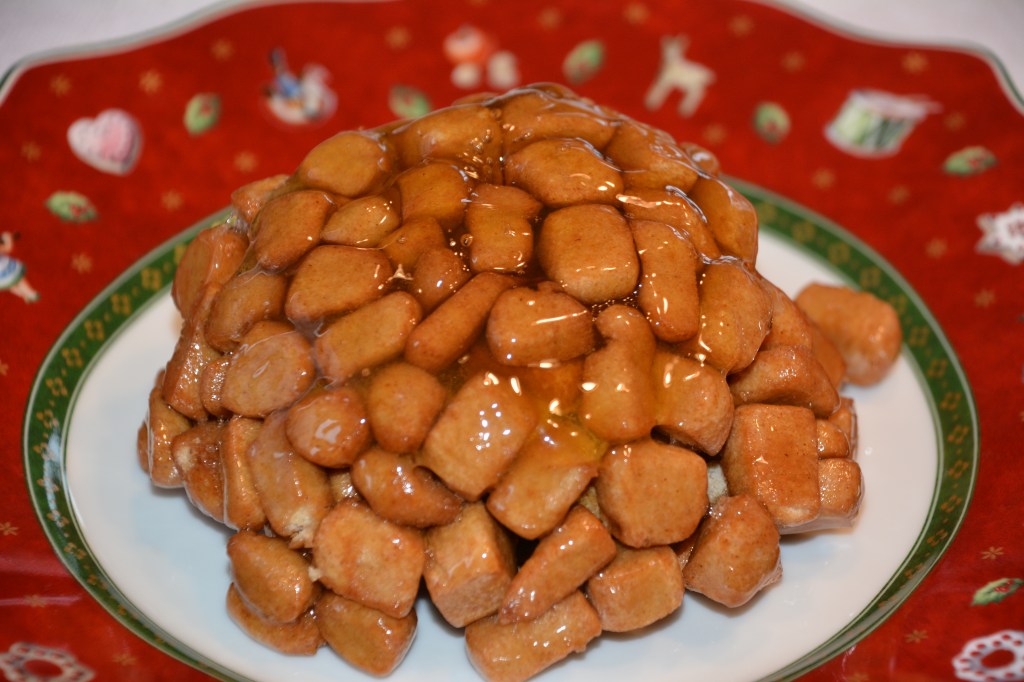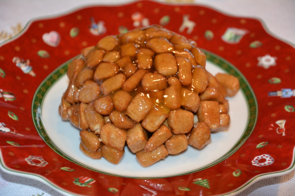 Zutaten: Teig: 200 g Mehl, 2 Eier, 1 EL Wodka, Salz, Öl zum Frittieren; Sirup: Honig 3 EL, 1 EL Zucker; den Teig kneten, 30 Minuten ruhen lassen; Teig ausrollen (ca. 5 mm Dicke), in Würfeln 5 x 5 mm schneiden, frittieren, abtropfen und abkühlen lassen; Honig und Zucker kurz aufkochen, mit den Teig-Würfeln vermischen, abkühlen