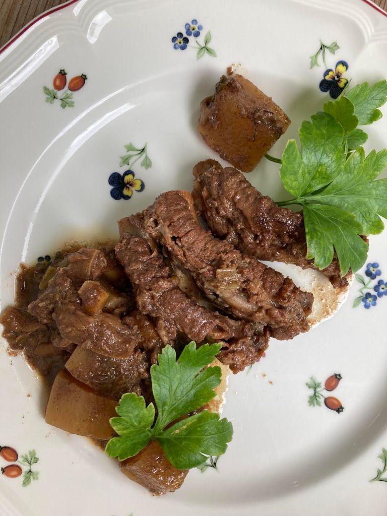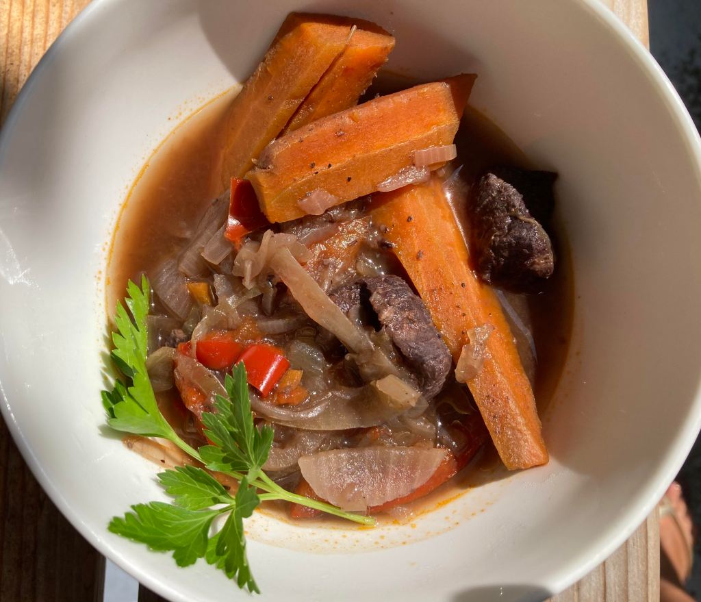 Zutaten: 500 g Rundfleisch in Würfeln; 3 Möhren, 1 Stange Porree, 1 Rote Paprika, 3 Zwiebeln, 1/2 Kopf Weißkohl; das Gemüse schneiden, in Schichten (Kraut, Paprika, Zwiebeln, Porree, Sellerie) in Dutch oven platzieren, salzen, etwas Chili-Pulver; das Fleisch zuerst kurz scharf anbraten, danach auf das Gemüsebett drauf tun, würzen; ca. 0,75 ml Rotwein drüber gießen, alle Zutaten sollen bedeckt werden; in einem Holzbackofen bei 130-150 Grad 2 Stunden backen.