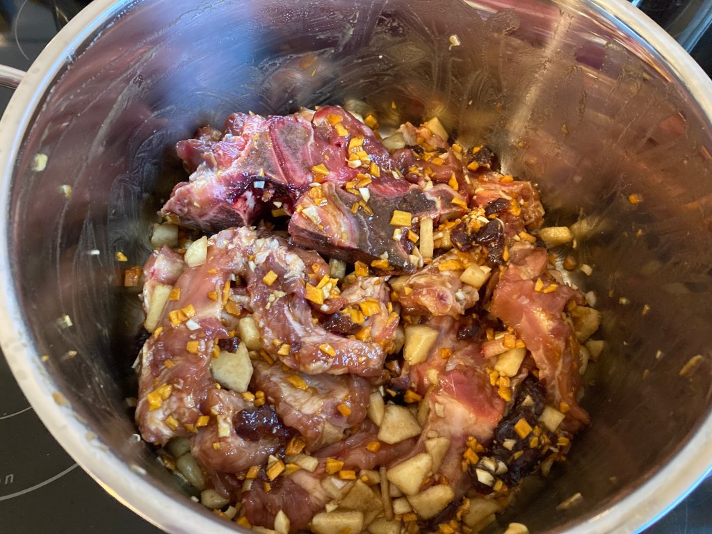 Zutaten: Schwein-/Rinderrippen mit einer Mischung aus Sojasoße (100 ml), Kaki-Getrocknet (50 g), 1 Birne, Knoblauchzehen (beliebig), Datteln-Getrocknet (5-6 St) und 1 Glass Wasser langsam 1,5 Stunden schmoren; Rettich grob schneiden (beliebig viel), 2 Möhren, 1 Bund Frühlingszwiebel zum Fleisch geben und noch 30 Minuten das Gericht köcheln.