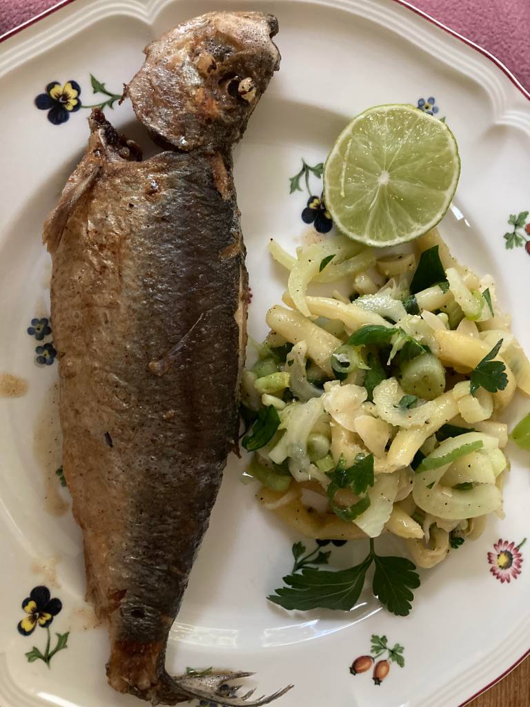Zutaten: 200 g frische weiße Bohnen ca. 10 Minuten leise köcheln; Fenchel 1 Köpfchen, Frühlingszwiebel (beliebig), gehobene Mandel-Blättchen, Petersilie klein schneiden; alle Zutaten zusammen vermischen, salzen, in Öl (Mischung aus Oliven- und Walnussöl ca. 3:1) und etwas Walnuss-Essig 2-4 Stunden marinieren.