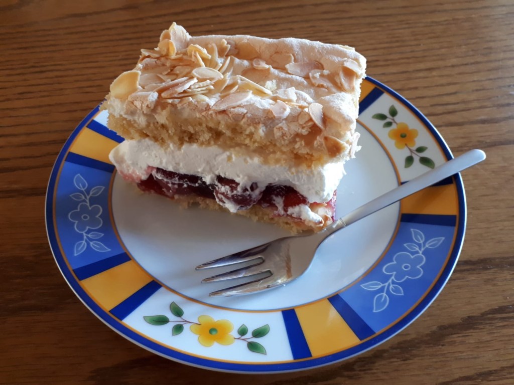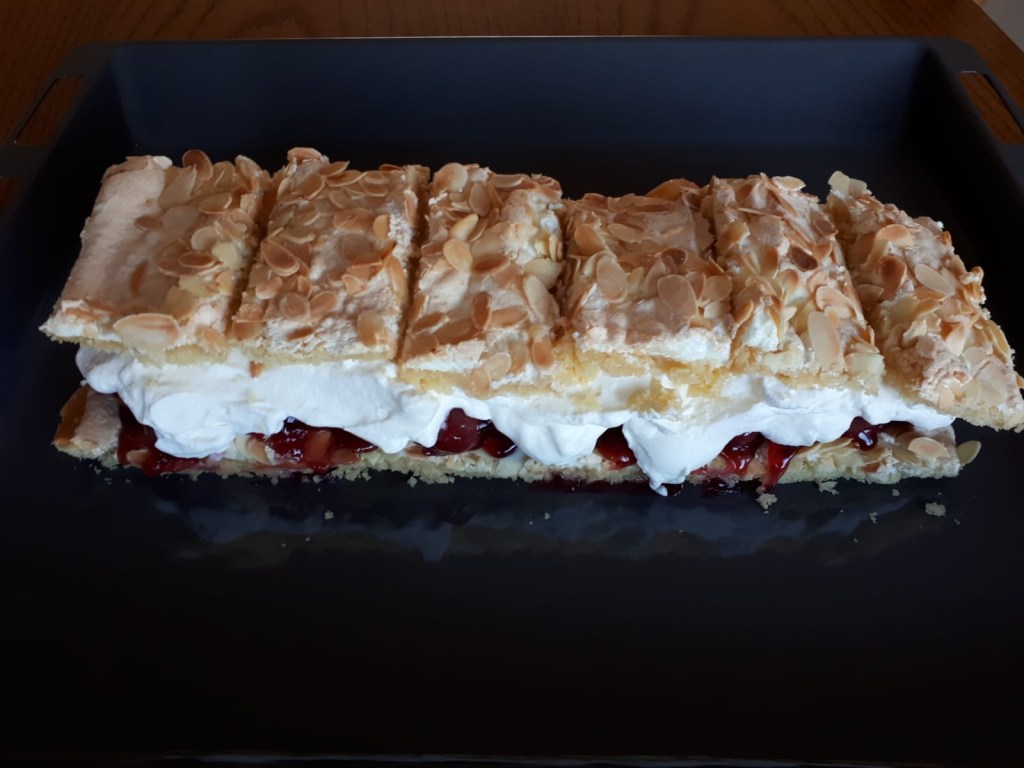 Zutaten: Boden: 180 g Butter, weich, 180 g Zucker, 4 Eigelb, 300 g Mehl, 3 TL Backpulver, glattgestrichen, 7-8 EL Milch oder Wasser; Baiser: 4 Eiweiß, 200 g Zucker, 100 g Mandeln, gehobelt; Belag: 1 Glas Sauerkirschen (350g Abtropfgewicht), 2 Pckg Tortenguss, 500 ml Sahne
