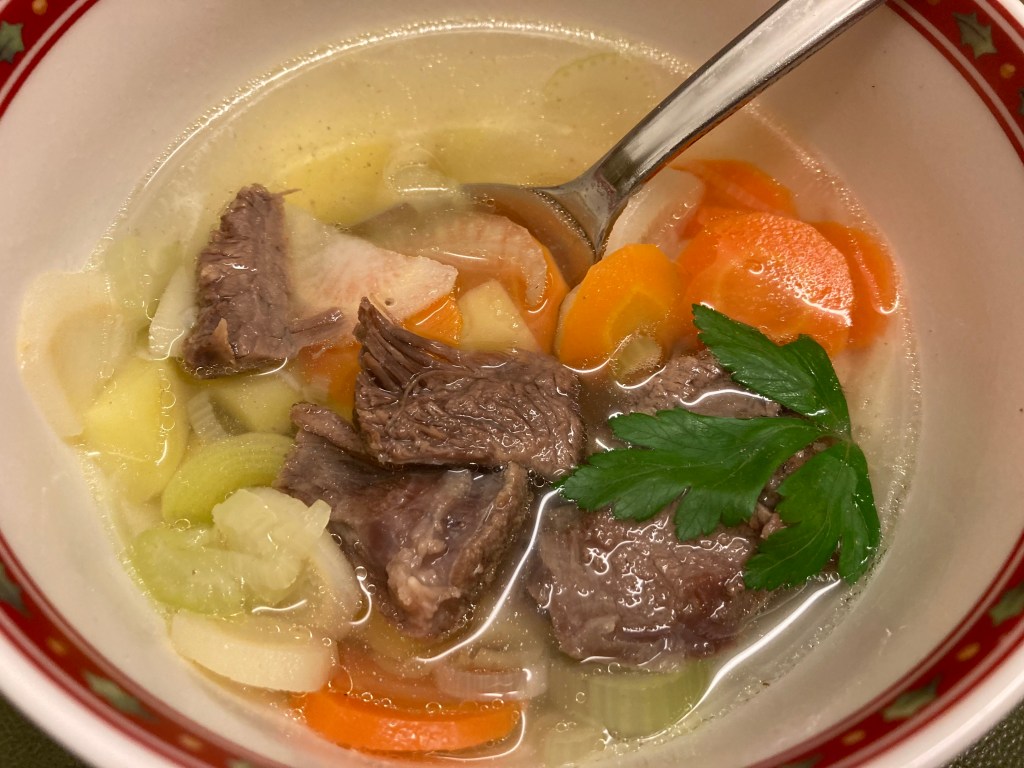 Zutaten: 1 Rinderbeinscheibe, Salz, 1 Lorbeerblatt, Gewürznelken, 1Möhre, 1 Petersilienwurzel, 1/2 Stange Porree, 1 Stange Sellerie, 300 g Kartoffeln; die Beinscheibe in 1 L Wasser ca. 1,5 Stunden kochen; das Gemüse schneiden (bis auf die Kartoffeln) in Öl anschwitzen, danach die Kartoffeln und die Rinderbrühe dazu geben, 20 Minuten köcheln lassen, die Kartoffeln sollen gar werden, aber nicht verkocht; die gekochte Beinscheibe vom Knochen befreien, das Fleisch würfeln und als Einlage in die Suppe geben; die Suppe mit frisch geriebener Muskatnuss abschmecken.